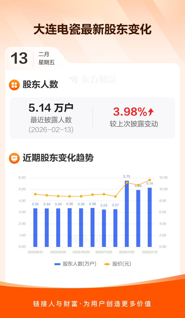 大连电瓷最新披露数据显示,截至2月13日公司股东户数为5.14万户,较上期(2026年1月31日)增加1969户,增幅为3.98%。户均持有流通股数量由上期的8519股下降至8193股,户均持股金额由上期的9.14万元增加至9.51万元。