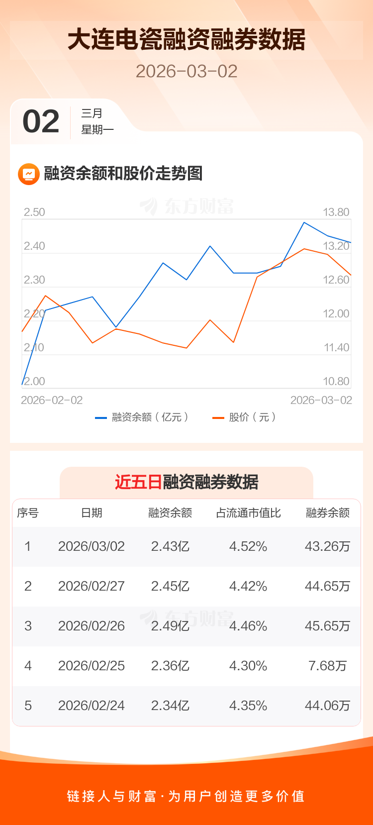 交易所最新数据显示,大连电瓷于2026年3月2日获融资买入4278.60万元,融资偿还4430.32万元,当日融资净偿还151.72万元。目前,该股融资余额2.43亿,占流通市值比例为4.52%。