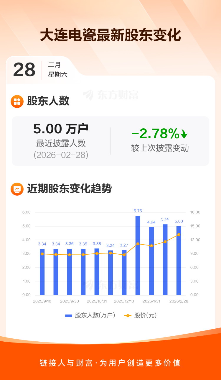 大连电瓷:截至2月28日最新股东户数5.00万户,较上期减少2.78%