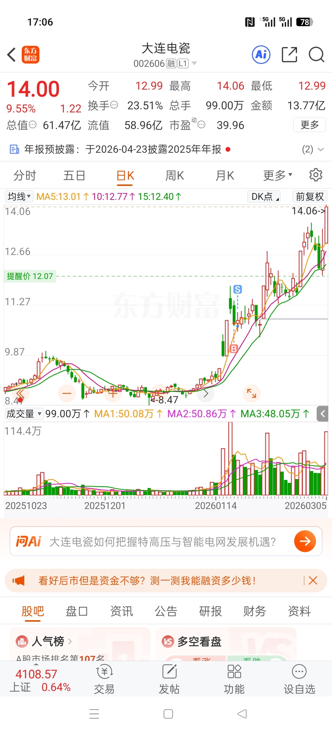 $大连电瓷(SZ002606)$ 这个都走了趋势,12.07提醒价放了好多天都忘记了,