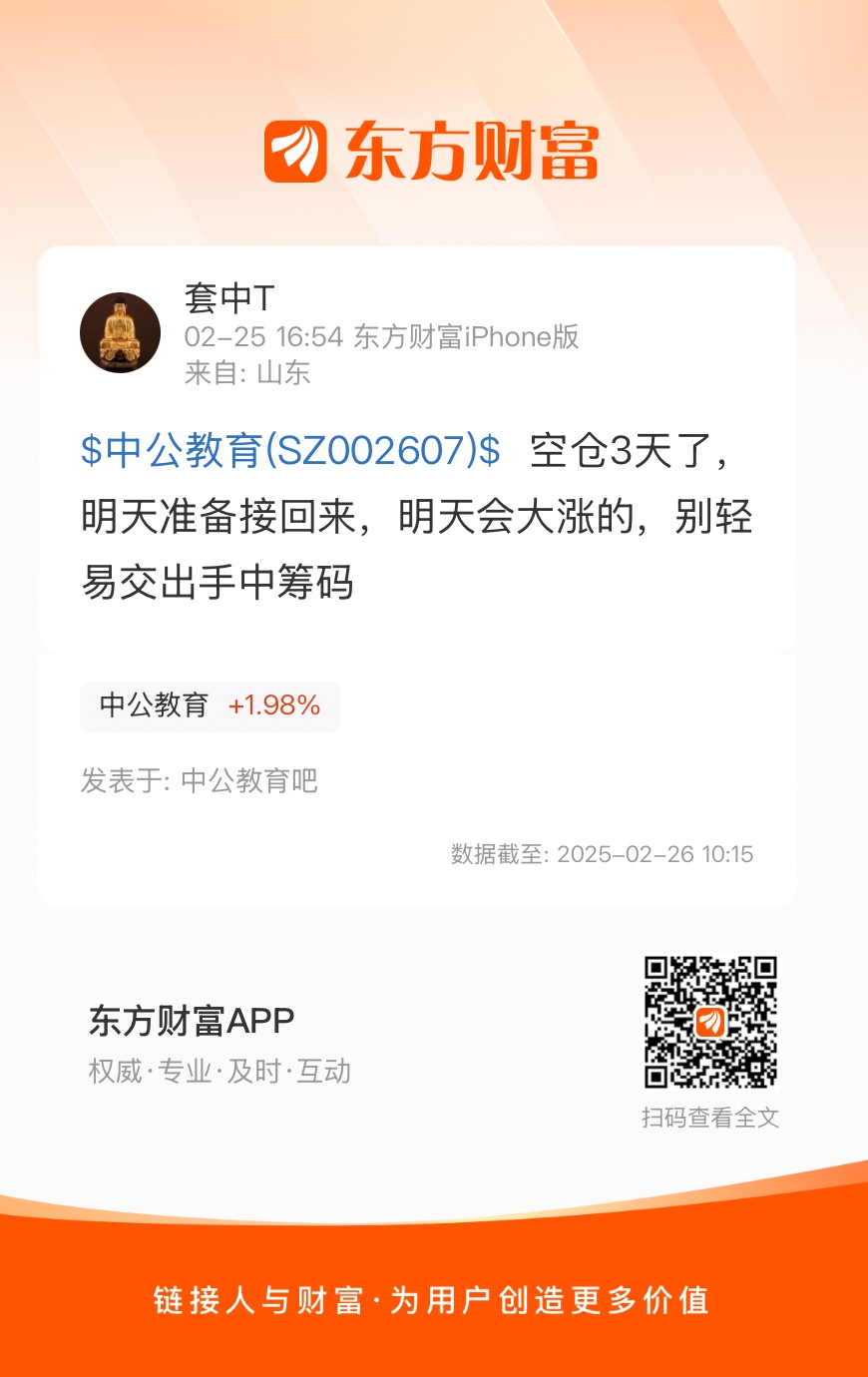 $中公教育(SZ002607)$  空仓3天了,明天准备接回来,明天会大涨的,别轻易交出手中筹码