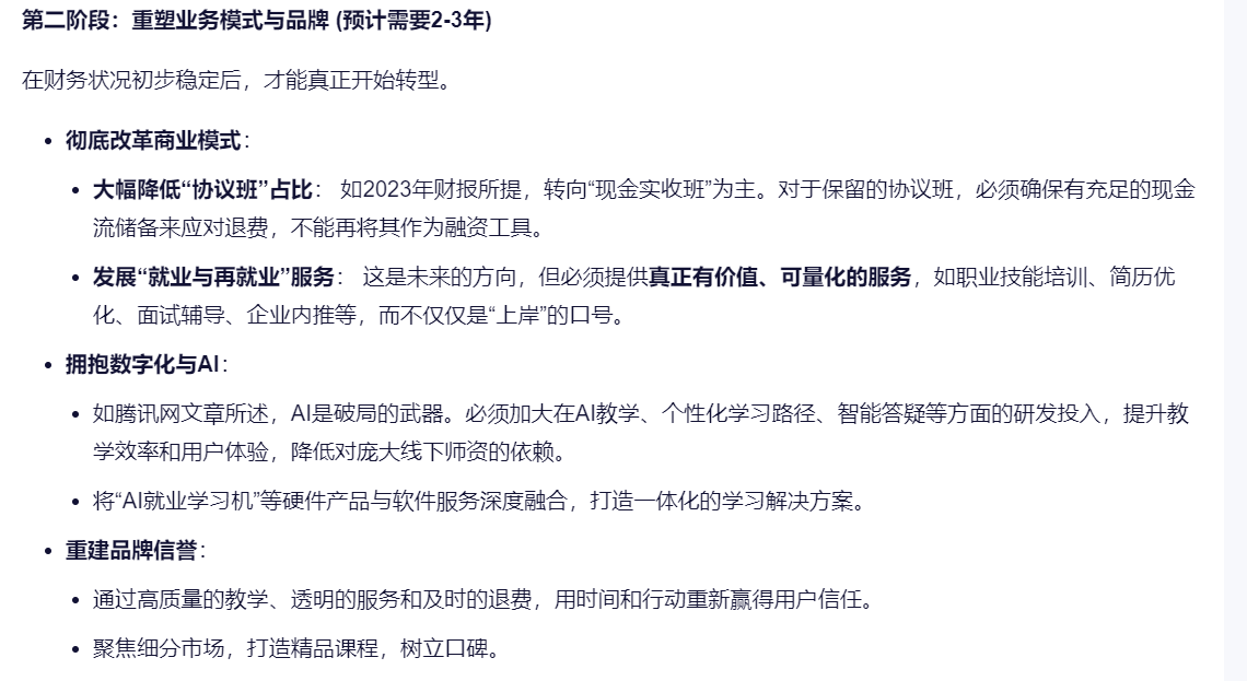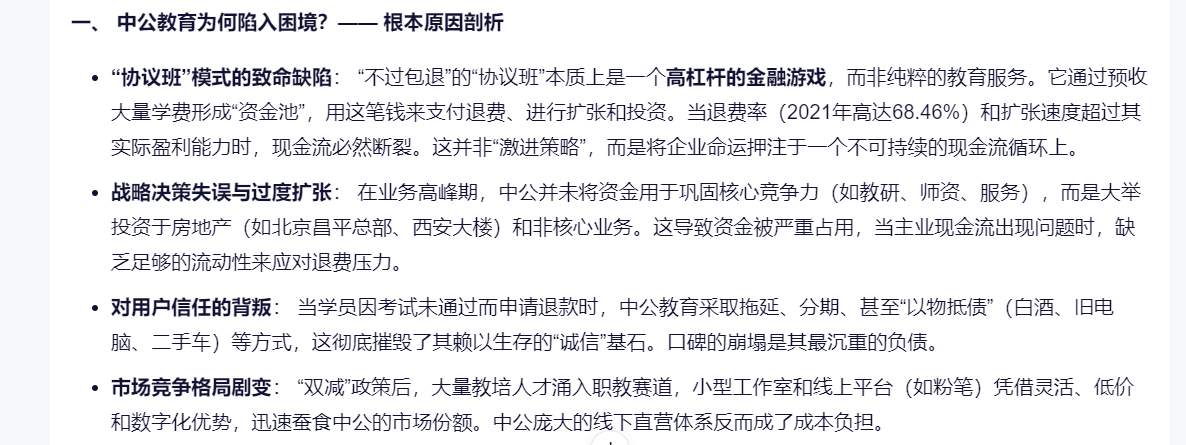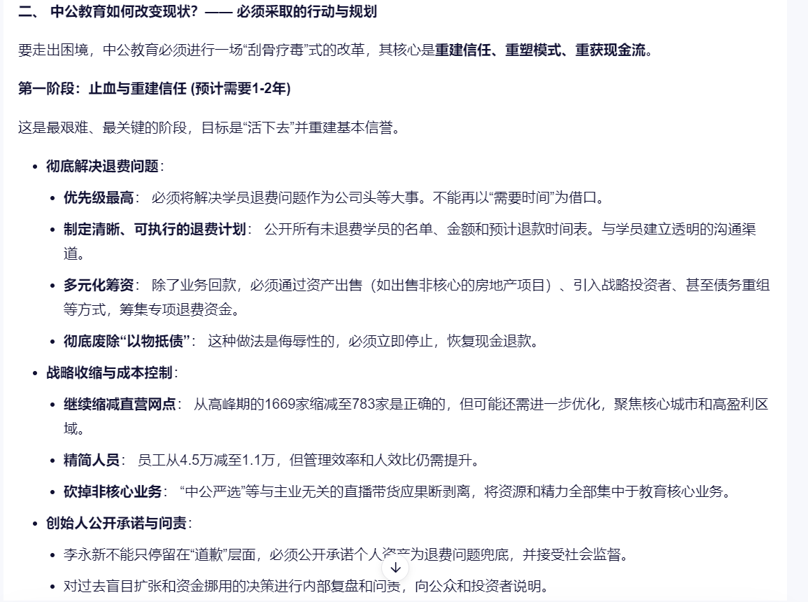 中公的问题其实已经清晰了,问题也不用深挖就是那些问题,现在就看创始人的决心了,就像通义千问说的那样:中公教育要走出当前困境,至少需要2-3年的时间,且过程充满不确定性。成功的关键在于是否能真正放下过去的“金融游戏”思维,回归教育本质,以极大的诚意和决心解决历史遗留问题,并坚定不移地进行数字化和业务模式的创新。如果只是“边退费边招生”的拖延战术,那么“走出困境”将遥遥无期