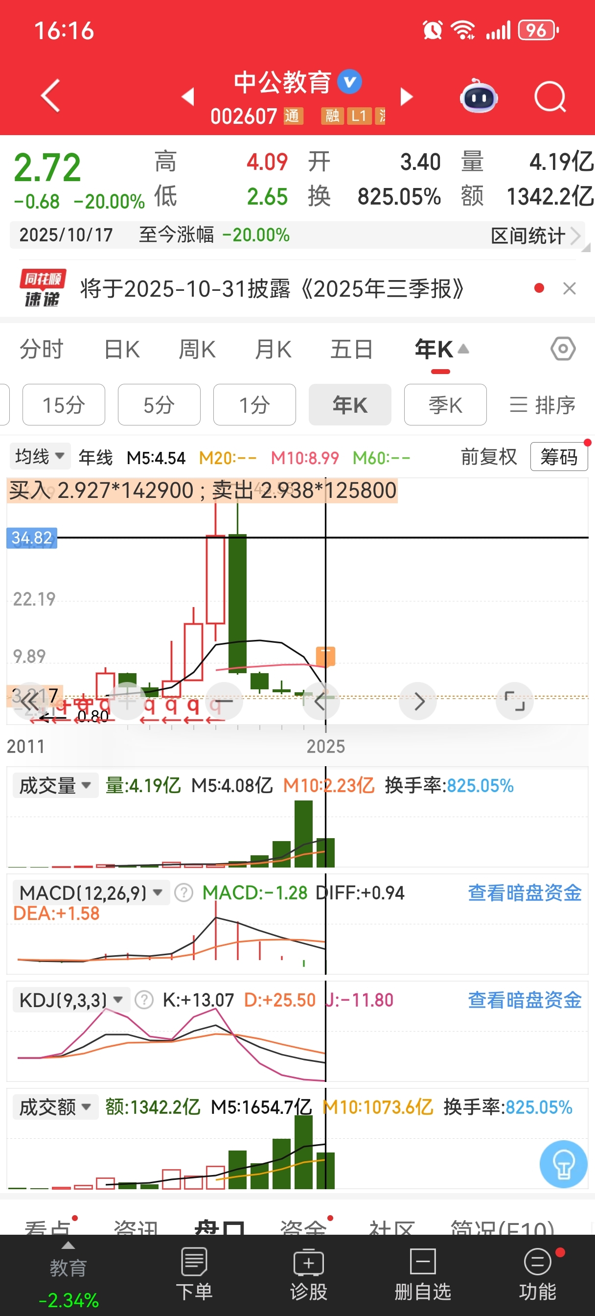 $中公教育(SZ002607)$ 这货今年跌了20个点,但是教育板块今年涨了九个点