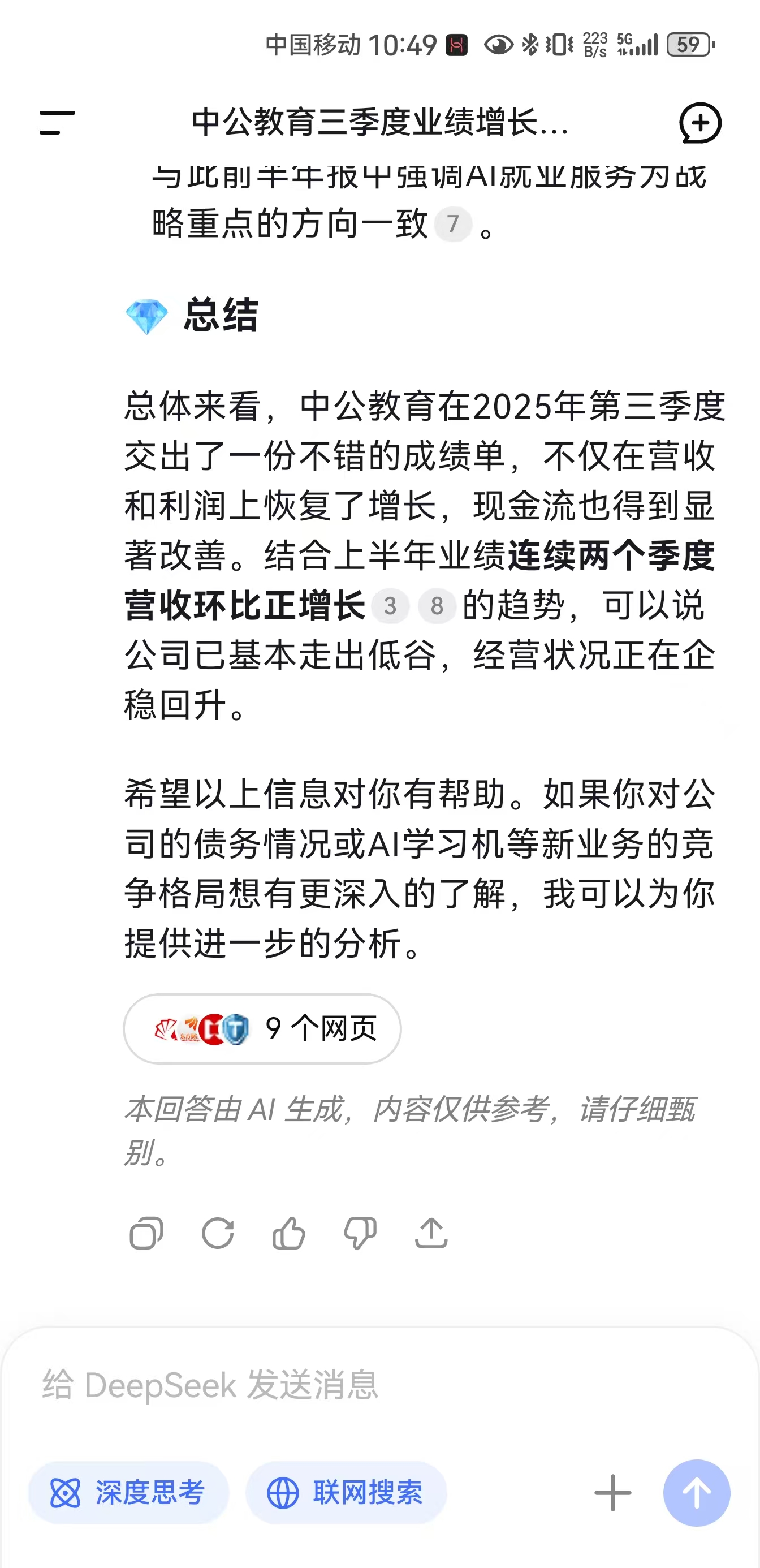 deepseek显示中公教育三季度业绩增长啊,结合9月底及十月份一直压单吸筹情况