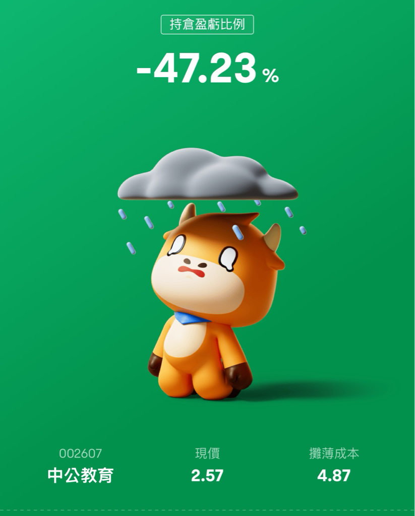 $中公教育(SZ002607)$ 这趋势是奔着退市去的吗,牛市走成这样,刚看了下港股账户,居然-47%,还好当时买的少,仓位不重,这么好的考公题材股被折腾成这样,目前这几天再观察下,不行就卖掉换粉笔长期拿着了