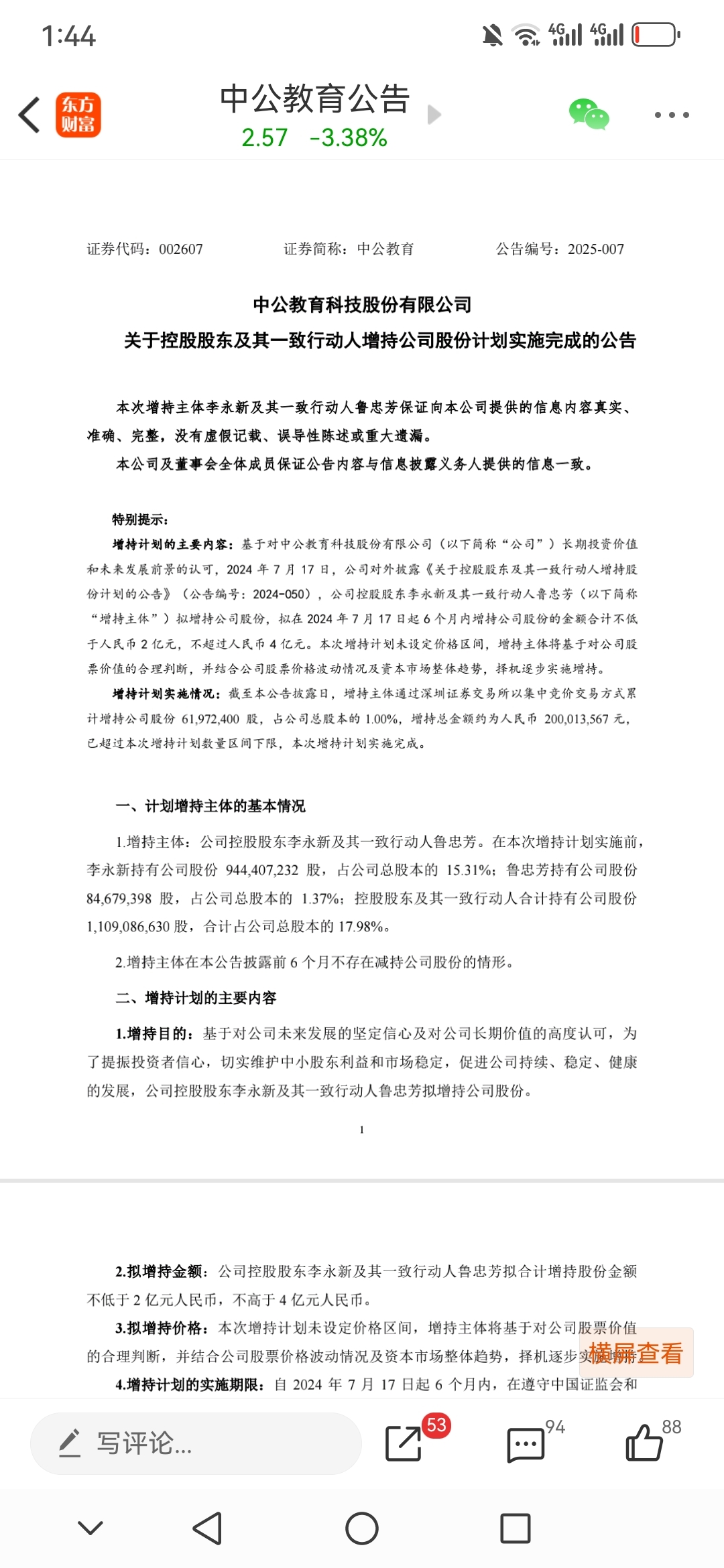 $中公教育(SZ002607)$ 三块多增持的,现在价格两块多,股东是不是也亏钱了