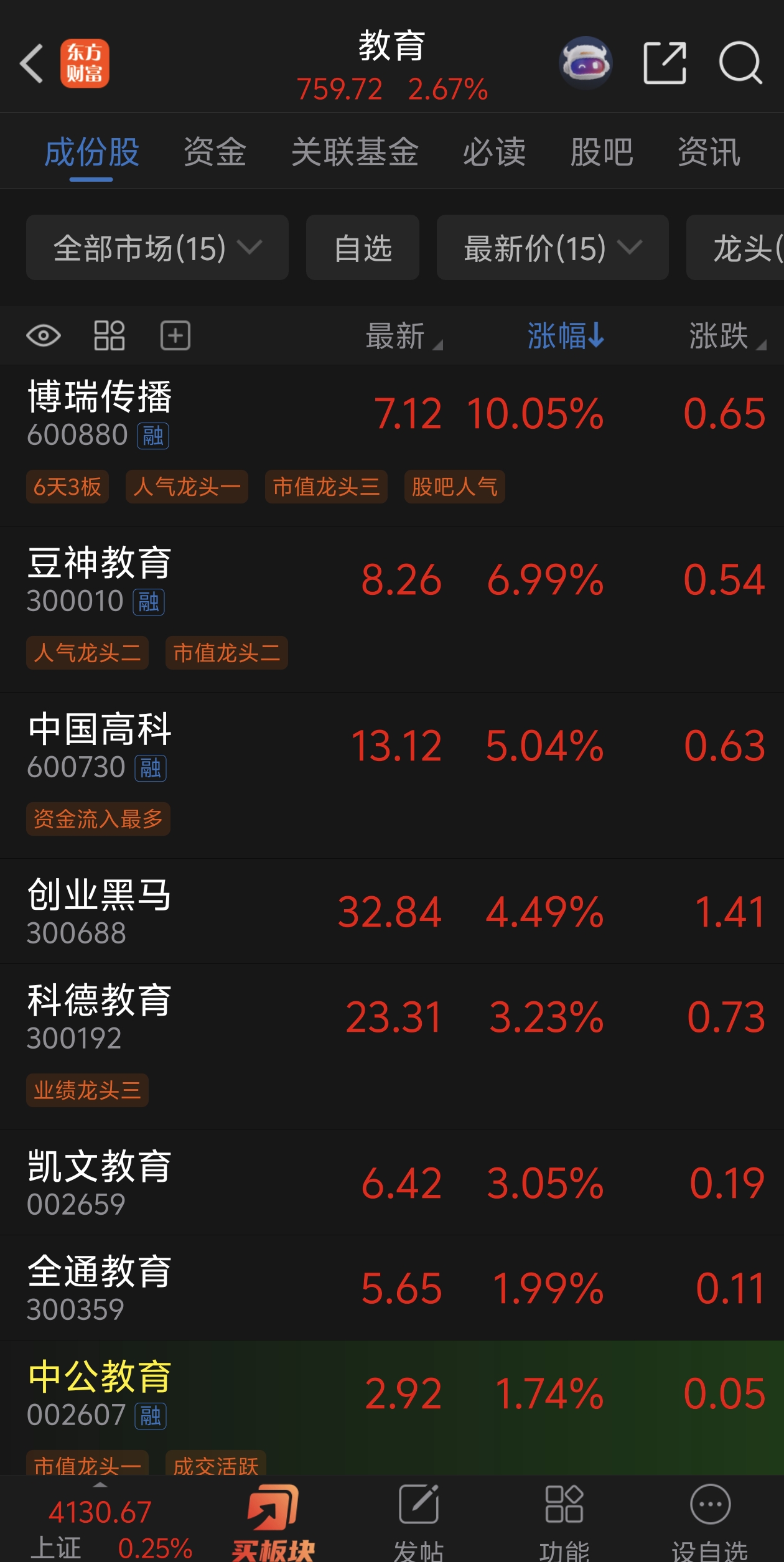 兄弟们看看板块啊都2.7%了中公就是量化控盘的。你看看板块回落了谁先跑