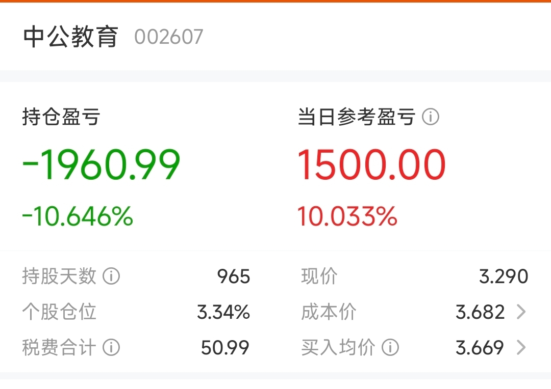 $中公教育(SZ002607)$ 还有谁,另一个账户14多块买的,持股五年,血亏80%割肉走了。现在这个账户磨了3年了,还差10%回本。之前在中公工作过一段时间,所以买了这破股。回本之后清掉,删除!
