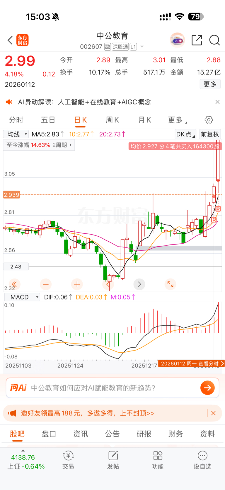 $中公教育(SZ002607)$ 幸福来的太突然,小仓位就是容易吃肉…