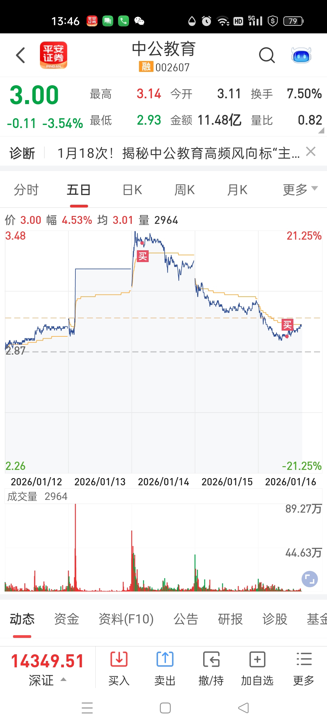 $中公教育(SZ002607)$ 3.43建,然后2.95补,成本为3.05