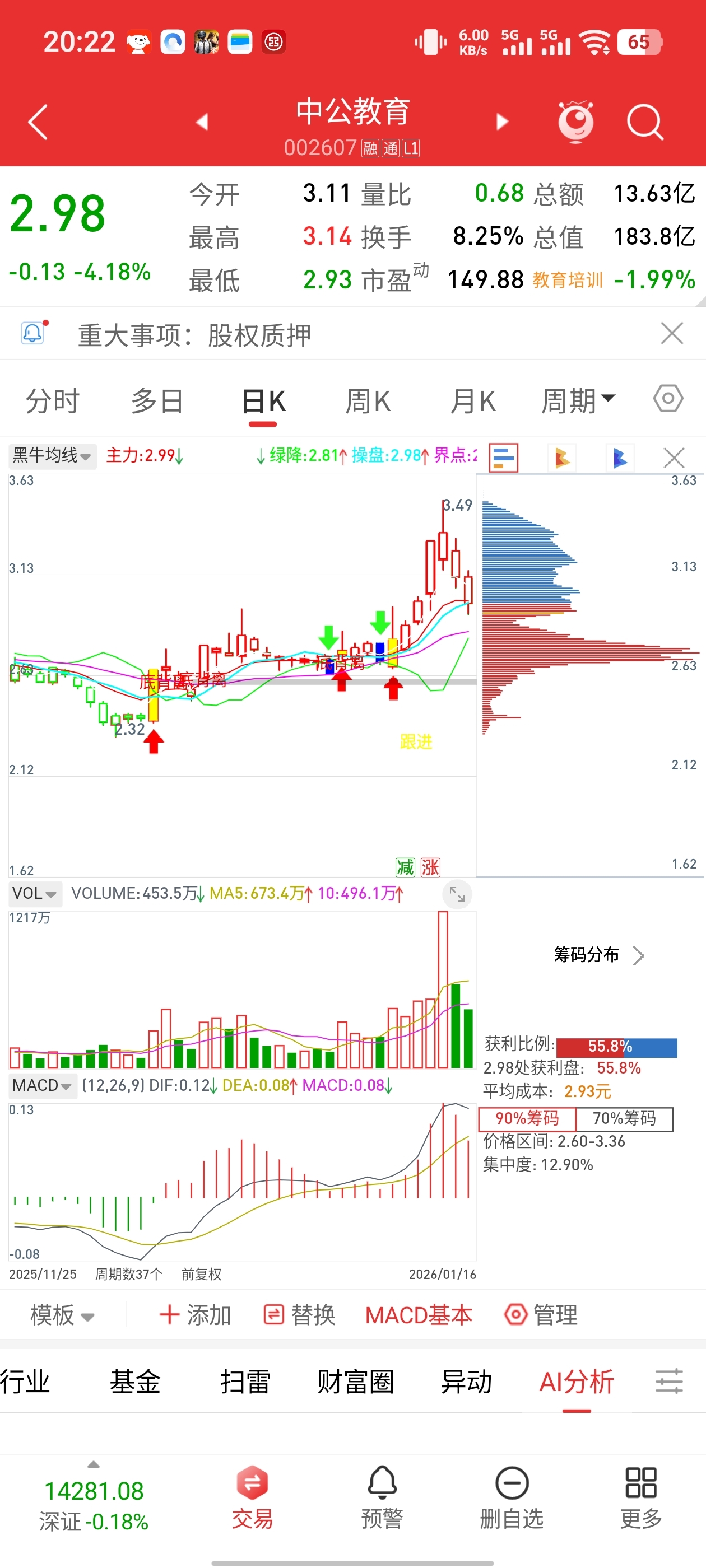 $中公教育(SZ002607)$ 作为十五年股民的分析,中公教育主力成本近15天成本大概在2.9-2.99左右,而且主力底部筹码基本没动,再跌也爹不到哪里去?除非人为踩踏,综合周五表现来看,AI应用集体跌停情况下,中公教育维持低位盘整,踩踏多数为散户割肉行为,主力求之不得正好完成了筹码清洗,散户多数都走了是好事,综合来看最迟下周二会有五个点以上的拉升,最迟周五有望收复在3.3以上。