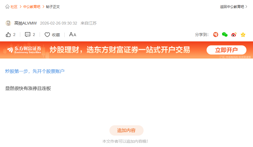 温馨提示: 1.根据《证券法》规定,禁止编造、传播虚假信息或者误导性信息,扰乱证券市场;2.用户在本社区发表的所有资料、言论等仅代表个人观点,与本网站立场无关,不对您构成任何投资建议。用户应基于自己的独立判断,自行决定证券投资并承担相应风险。《东方财富社区管理规定》