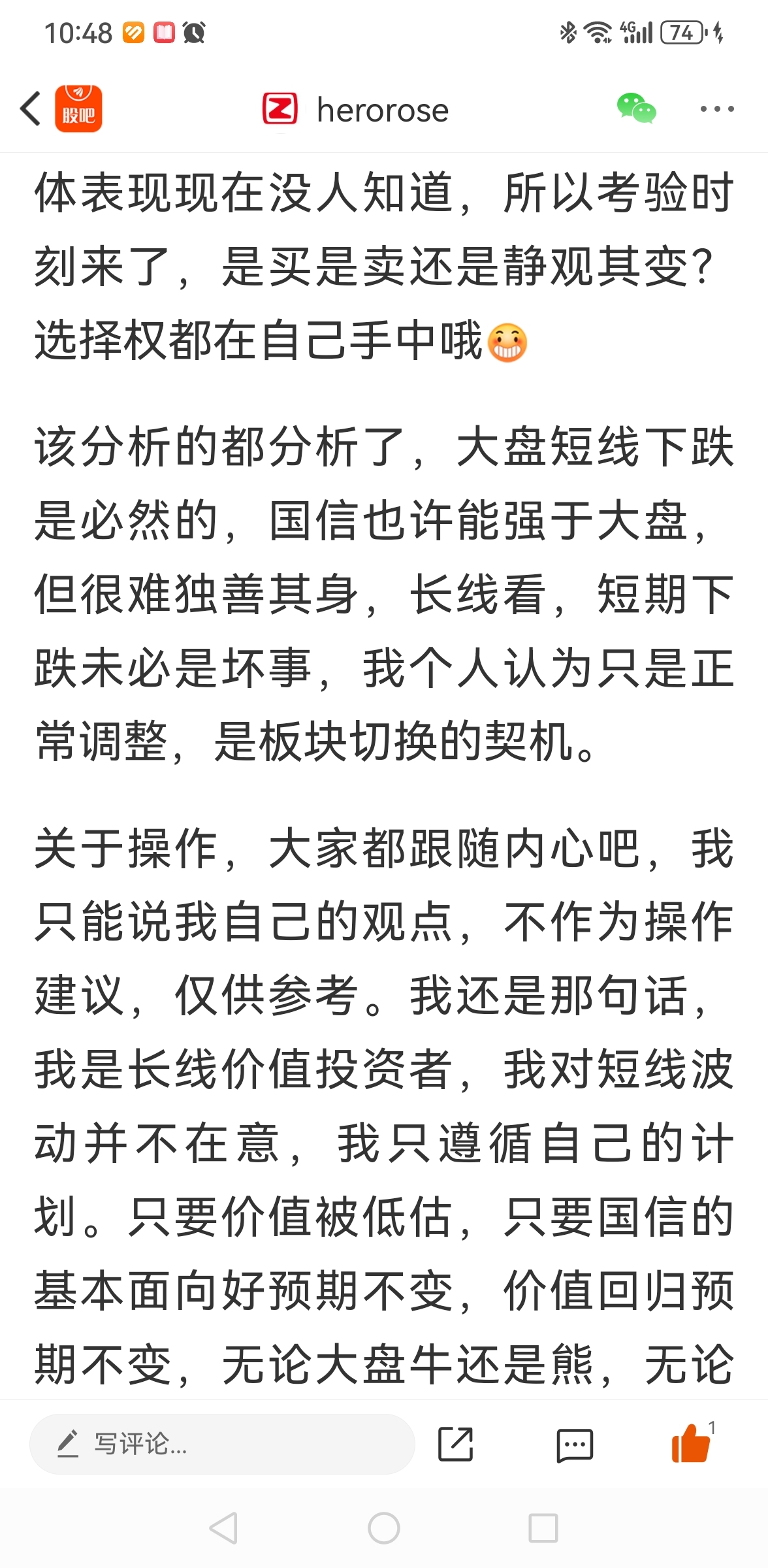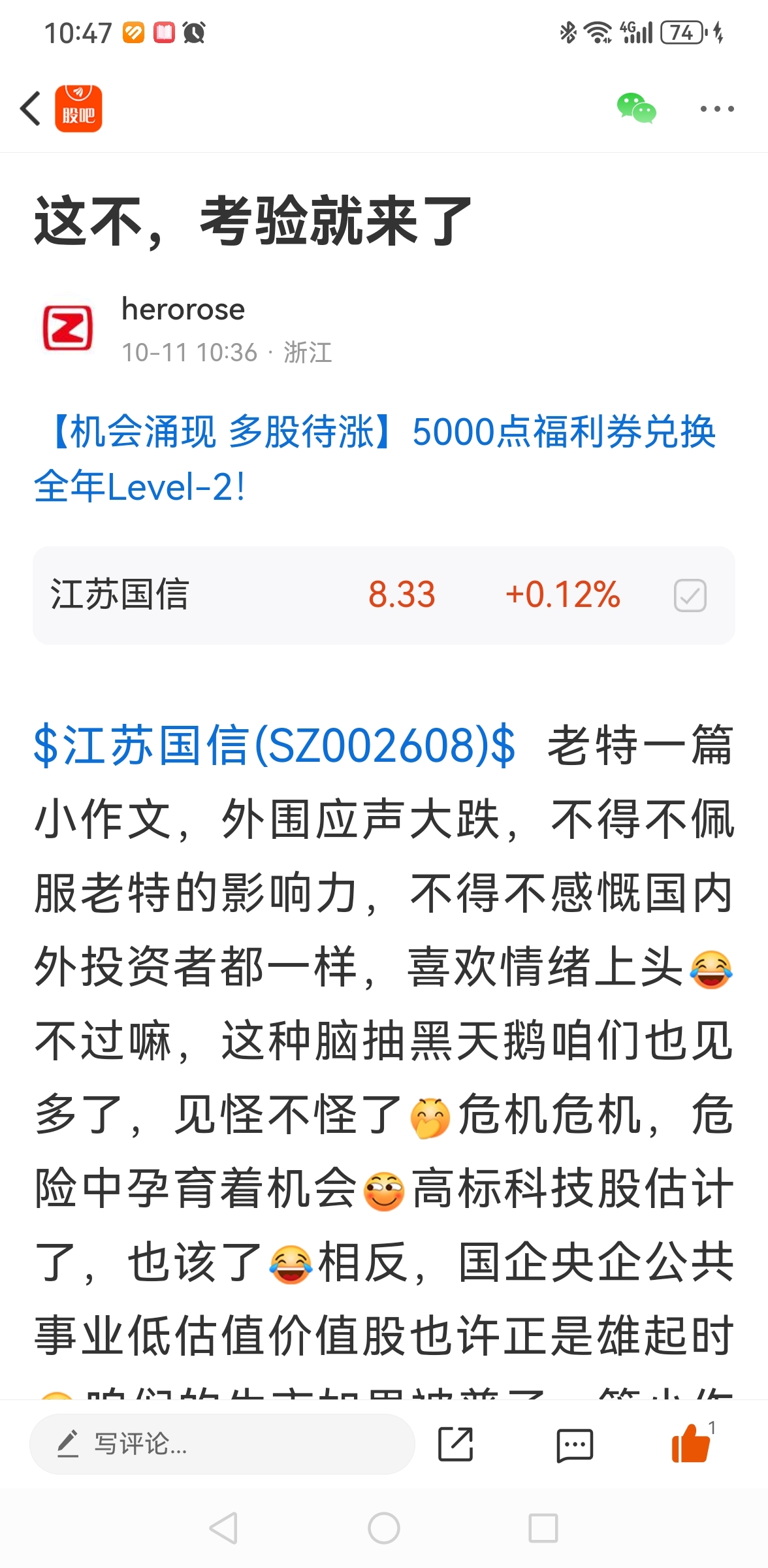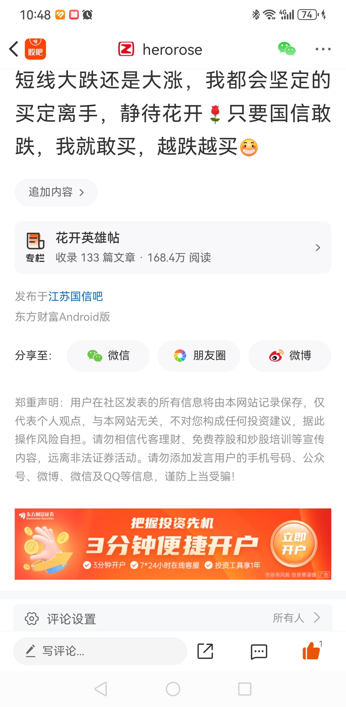 温馨提示: 1.根据《证券法》规定,禁止编造、传播虚假信息或者误导性信息,扰乱证券市场;2.用户在本社区发表的所有资料、言论等仅代表个人观点,与本网站立场无关,不对您构成任何投资建议。用户应基于自己的独立判断,自行决定证券投资并承担相应风险。《东方财富社区管理规定》