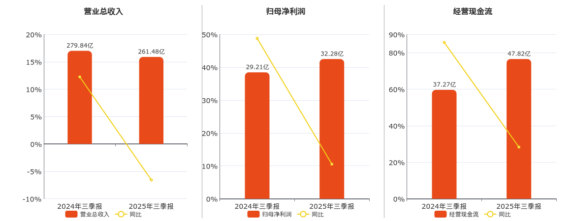 公司营业总收入为261.48亿元。归母净利润为32.28亿元,较去年同报告期归母净利润增加3.07亿元,实现3年连续上涨,同比较去年同期上涨10.52%。经营活动现金净流入为47.82亿元,较去年同报告期经营活动现金净流入增加10.54亿元,实现2年连续上涨,同比较去年同期上涨28.29%。