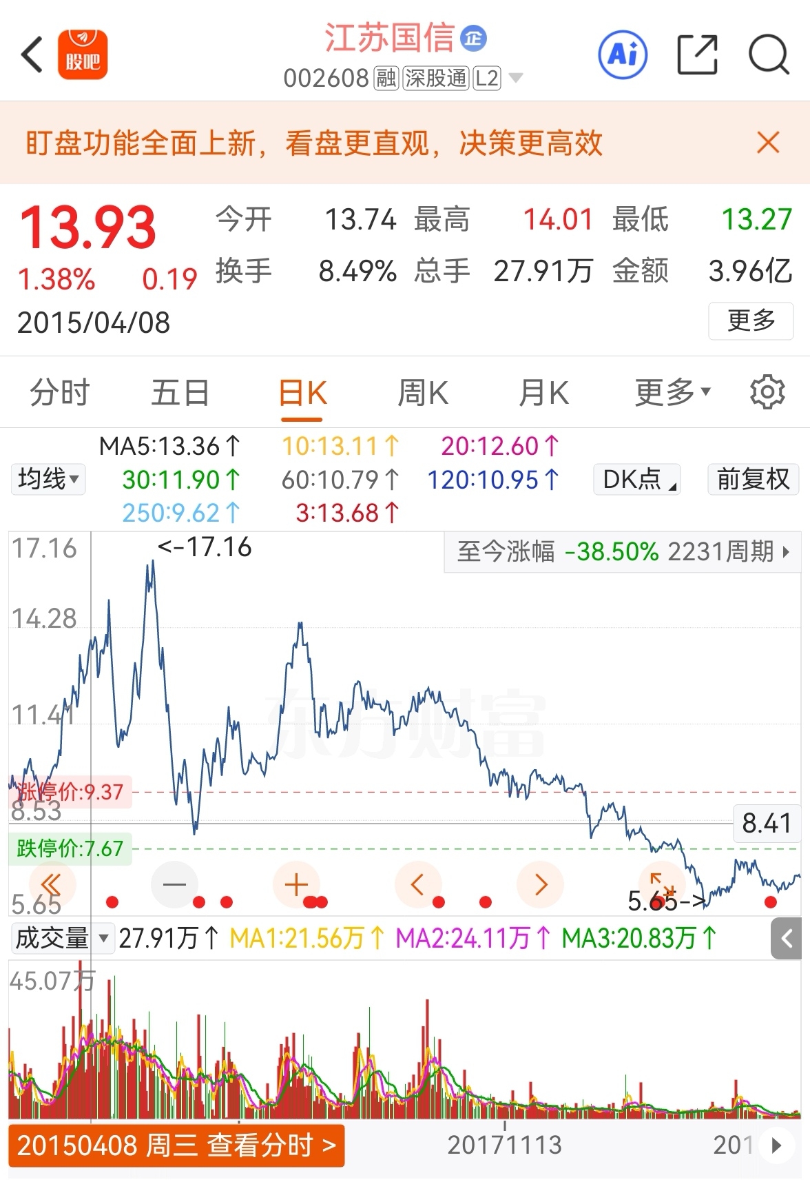 $江苏国信(SZ002608)$ 15年4月8日,上次大盘4000点,我们13.93,现在大盘重回4000,我们股价居然才8块多……居然还有人嫌贵怕跌,踌躇不前