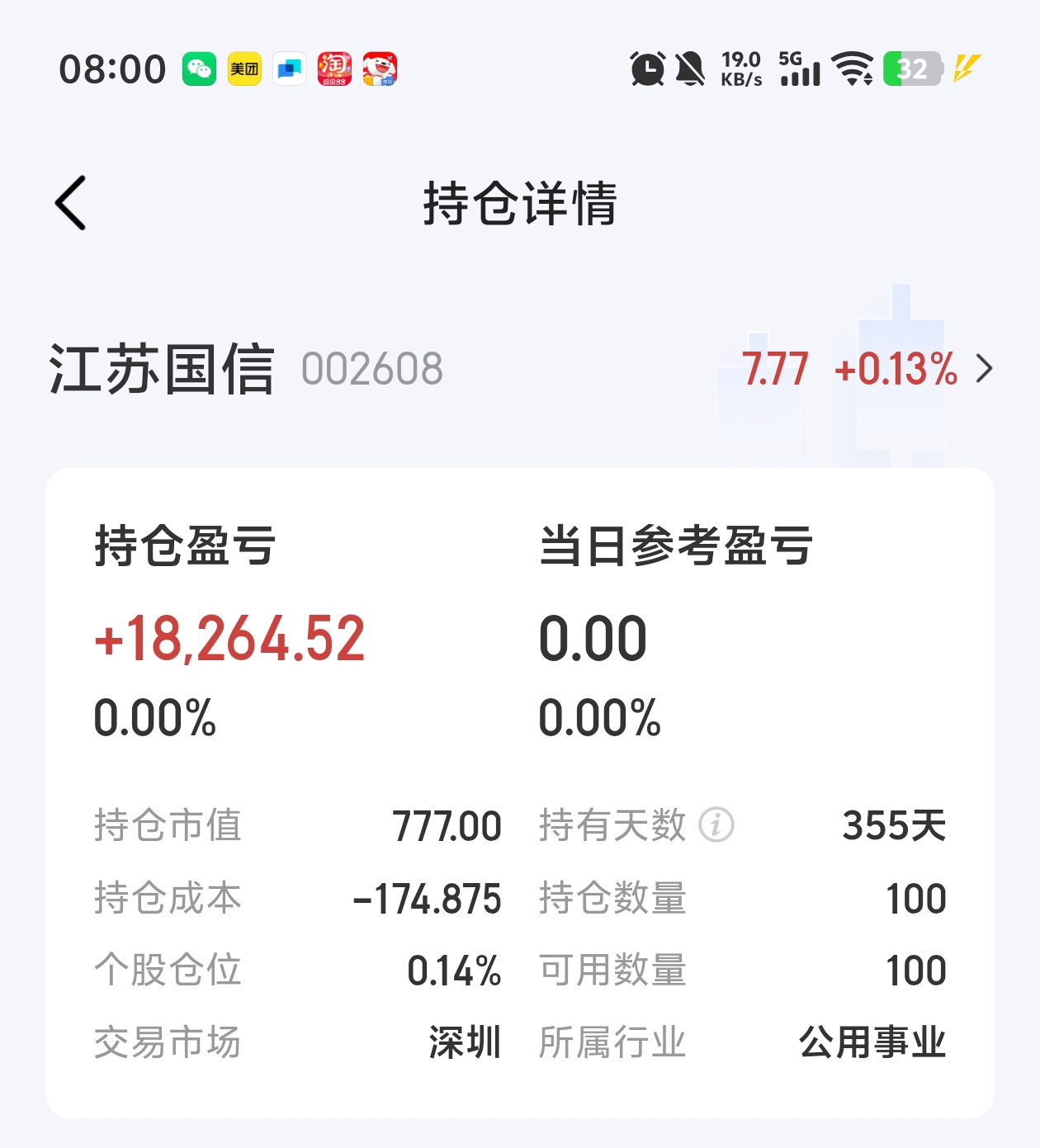 $江苏国信(SZ002608)$ 江苏国信,持仓了355天。其实现在的股价跟355天前相比,还是亏的,跌的。