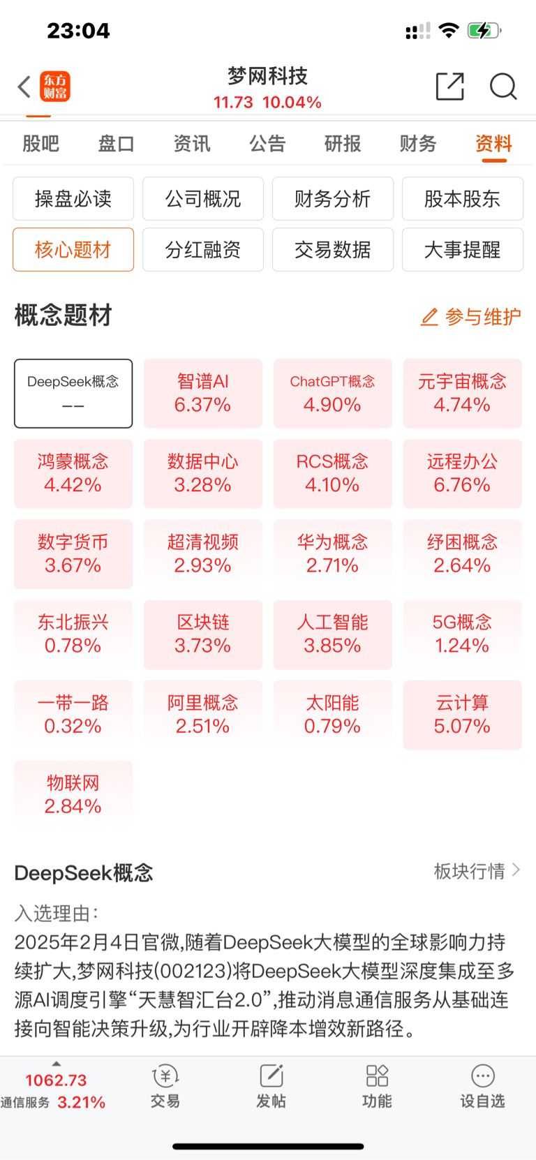 你小弟梦网科技增加了东方财富DeepSeek概念股:明天一字板,你也该板板了