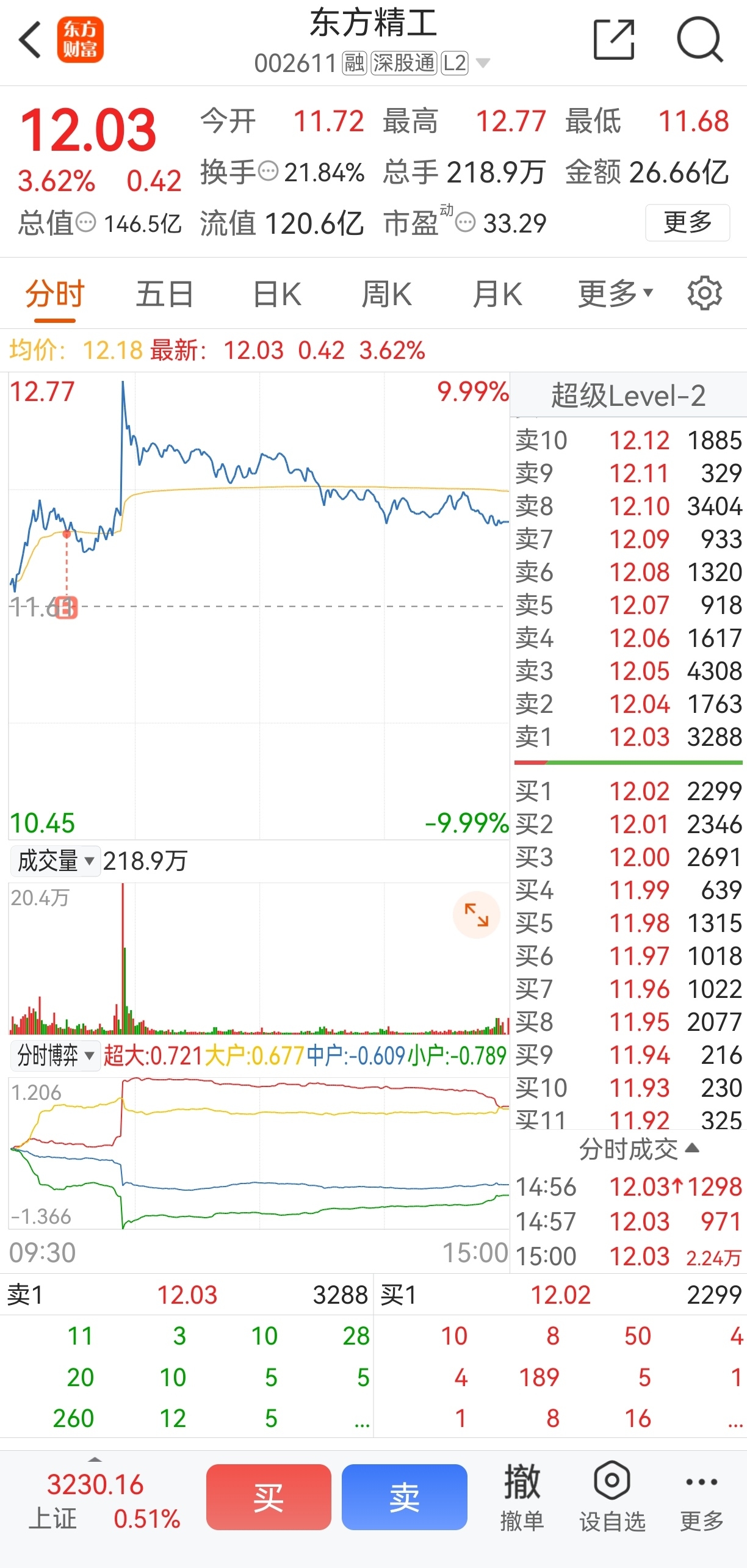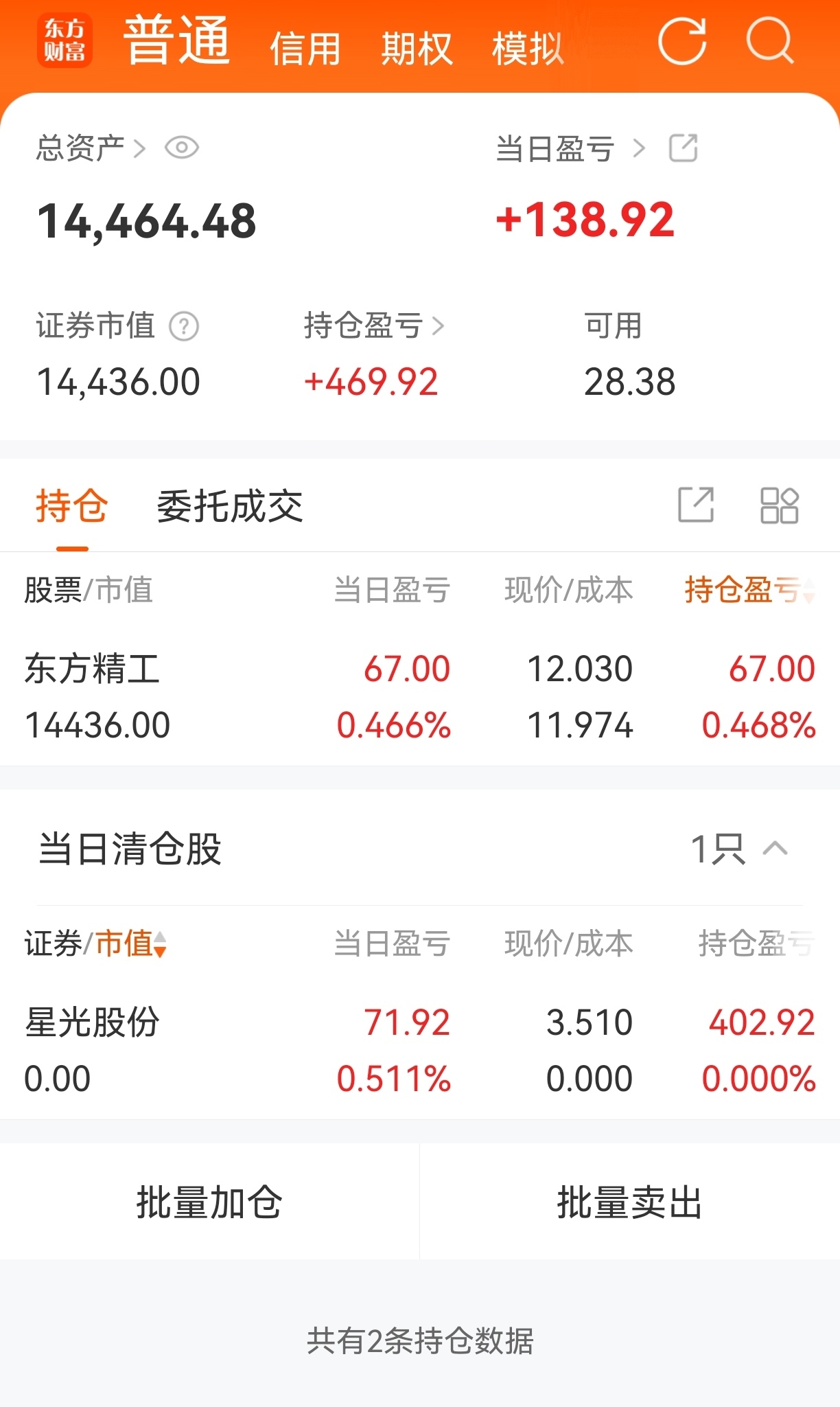 早上$东方精工(SZ002611)$ 直线拉涨停的时候以为稳了,终于在年前抓到一次涨停了,结果差1W多手没有资金封板。然后就没然后了,整个下午一点反弹的迹象都没有,更是跟着大盘一起跳水了。早上有多高兴,下午就有多郁闷。希望明天来个反包吧,不然还得亏钱出去。