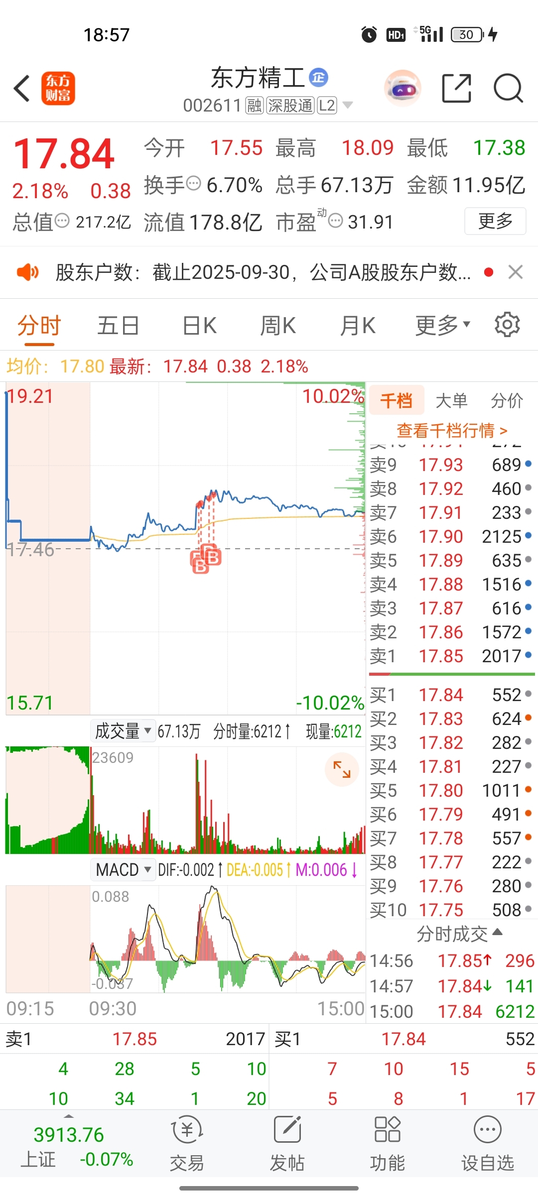 $东方精工(SZ002611)$ 今天追高了,现在有点瑟瑟发抖,明天怎么样就看主力的了,大跌就在买点!大涨就持股不动,主力我也是多头,带我飞吧