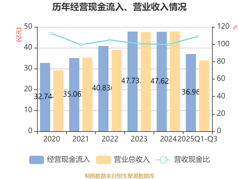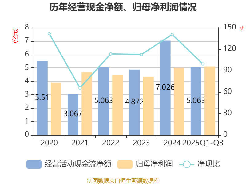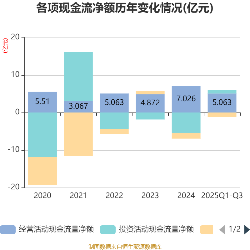 2025年前三季度,公司经营活动现金流净额为5.06亿元,同比增长180.4%;筹资活动现金流净额-1.24亿元,同比减少3917.71万元;投资活动现金流净额9400.52万元,上年同期为-2.83亿元。