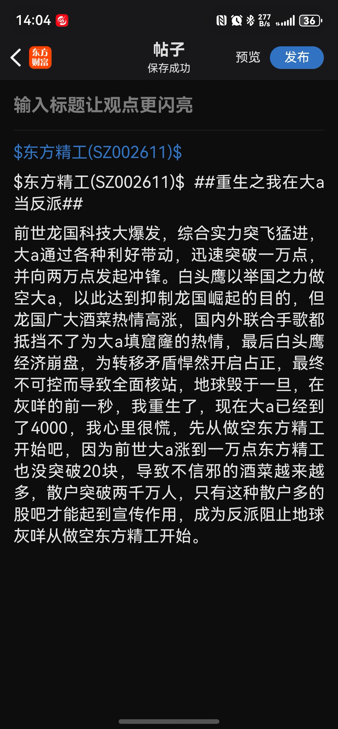 温馨提示: 1.根据《证券法》规定,禁止编造、传播虚假信息或者误导性信息,扰乱证券市场;2.用户在本社区发表的所有资料、言论等仅代表个人观点,与本网站立场无关,不对您构成任何投资建议。用户应基于自己的独立判断,自行决定证券投资并承担相应风险。《东方财富社区管理规定》