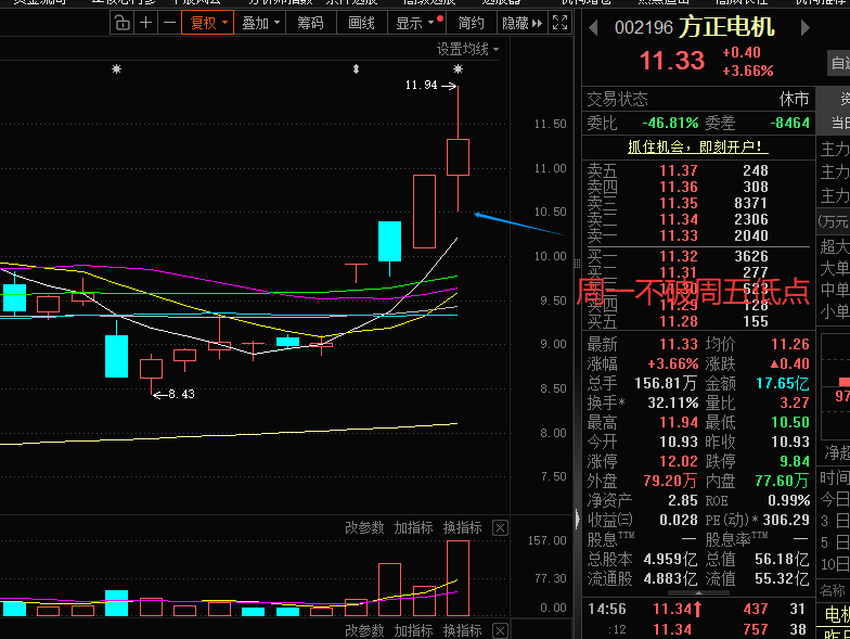 方正电机:方正电机是G内新能源汽车驱动电机的重要供应商,客户包括蔚来、小鹏、理想、零跑等主流车企。今天理想的情况是方正电机日内震荡,不破周五日内低点,收盘价创新哈高,那么意味着周五只是上涨中继,趋势没有结束,否则就要看情况离场。