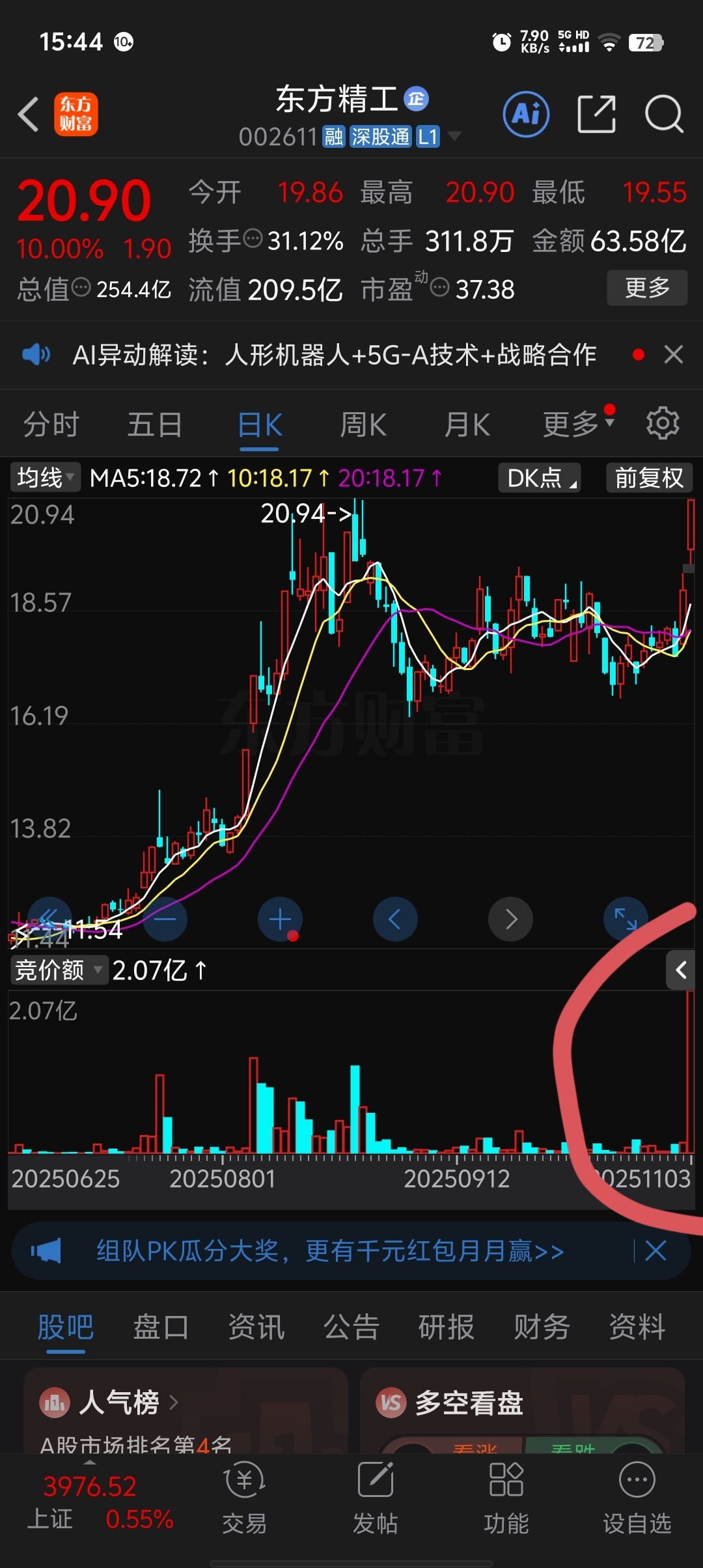 $东方精工(SZ002611)$ 量能跟上来,大涨的趁势