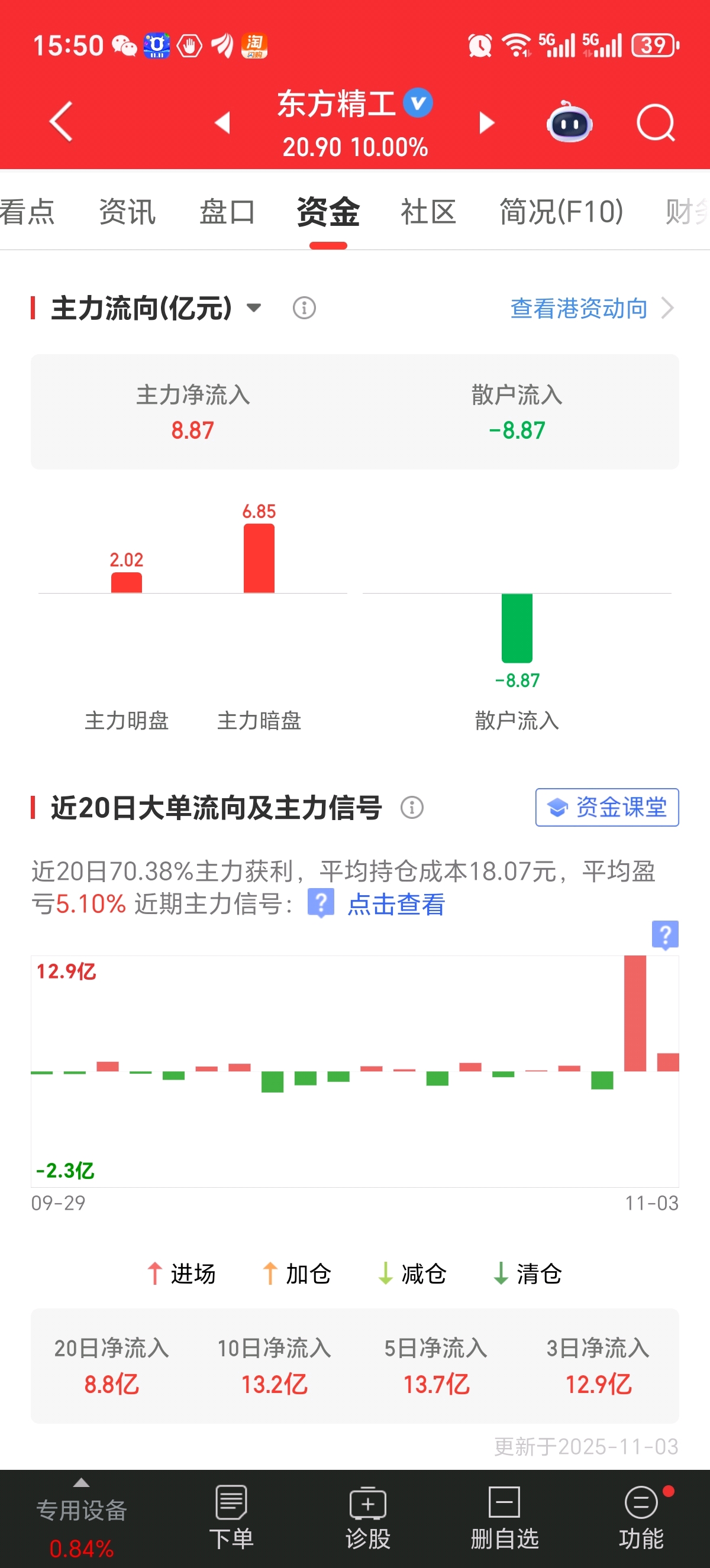 $东方精工(SZ002611)$ 二个交易日下来,散户被洗出二十多亿