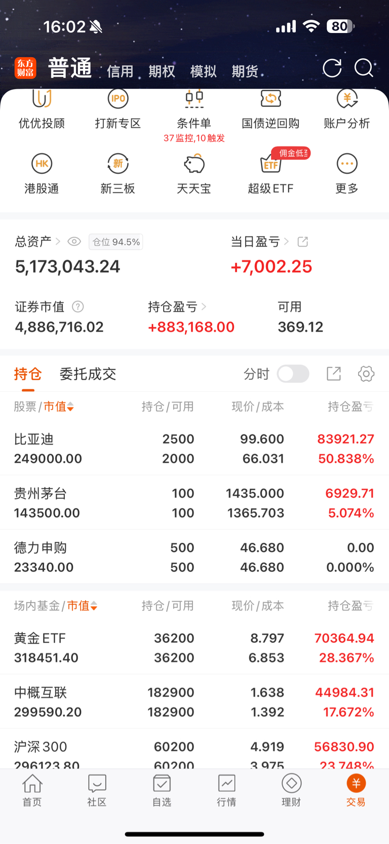万日定投第172天,今日周定投德国ETF五千元,触发条件单10笔,买入9笔,卖出1笔,今日收益: 0.7w