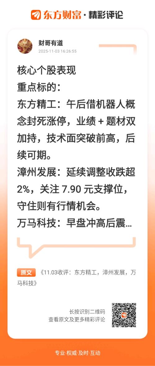 老师又更新啦//@财哥有道 :核心个股表现重点标的:$东方精工(SZ002611)$:午后借机器人概念封死涨停,业绩 + 题材双加持,技术面突破前高,后续可期。$漳州发展(SZ000753)$:延续调整收跌超 2%,关注 7.90 元支撑位,守住则有行情机会。$万马科技(SZ300698)$:早盘冲高后震荡下滑,尾盘微涨 0.17%,处于多头行情回落整理阶段。赛力斯:弱势震荡下行,空头占优,观望 152 元支撑位,暂持仓。凯美特气:空头主导股价下砸,量能放大、筹码溃散,暂离场。万向钱潮:多空分歧加剧,早盘冲高后遭空头反扑,先撤离。昆仑万维:全天震荡拉锯,仍处多头趋势,适合高抛低吸,继续持仓。利欧股份:低位震荡企稳,尾盘有承接,已介入,看好后续走势。指数与盘面概况指数:早盘回踩 20 日均线获支撑,午后震荡上行,收盘站上 10 日均线,超 3500 只个股走强,低位标的补涨显著。盘面:缩量背景下先抑后扬,个股涨多跌少。海南自贸区、AI 应用(游戏、文化传媒)、光伏设备表现突出;电池、贵金属、稀土永磁调整居前,市场情绪企稳,后续轮动行情有望延续。