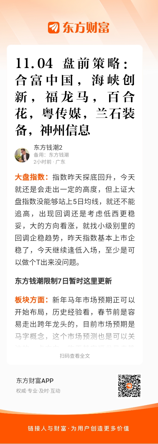 海峡创新(300300):股价还是延续5日均线的强势特征。昨天冲高回落的走势,但5日均线还是站稳了,今天还是有回踩5日均线的预期,只要股价不有效跌破5日均线就继续拿,入场做T先不打算,感觉海峡西岸概念要被十五全运会题材取代。只是个预测,盘中还是要看实际情况。这个票整体上5日均线上方持有就可以。