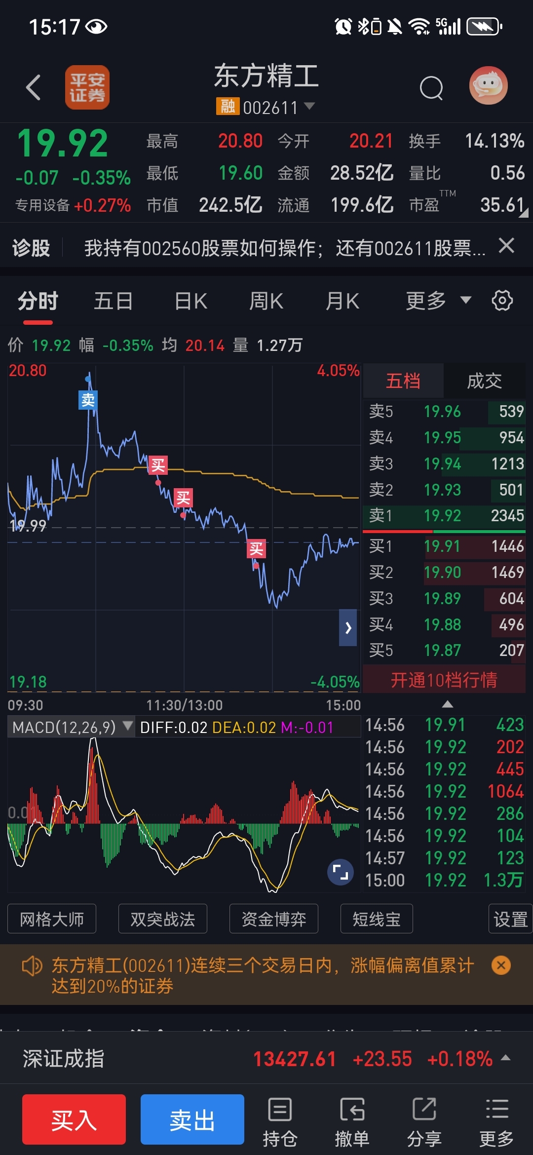 $东方精工(SZ002611)$ 卖在山顶抄在半山腰20.18,20还有19.78,可惜没有在山顶清仓,所以今日平均T了7毛钱,周五盈利缩减三分二,今日稍微回了一丢丢