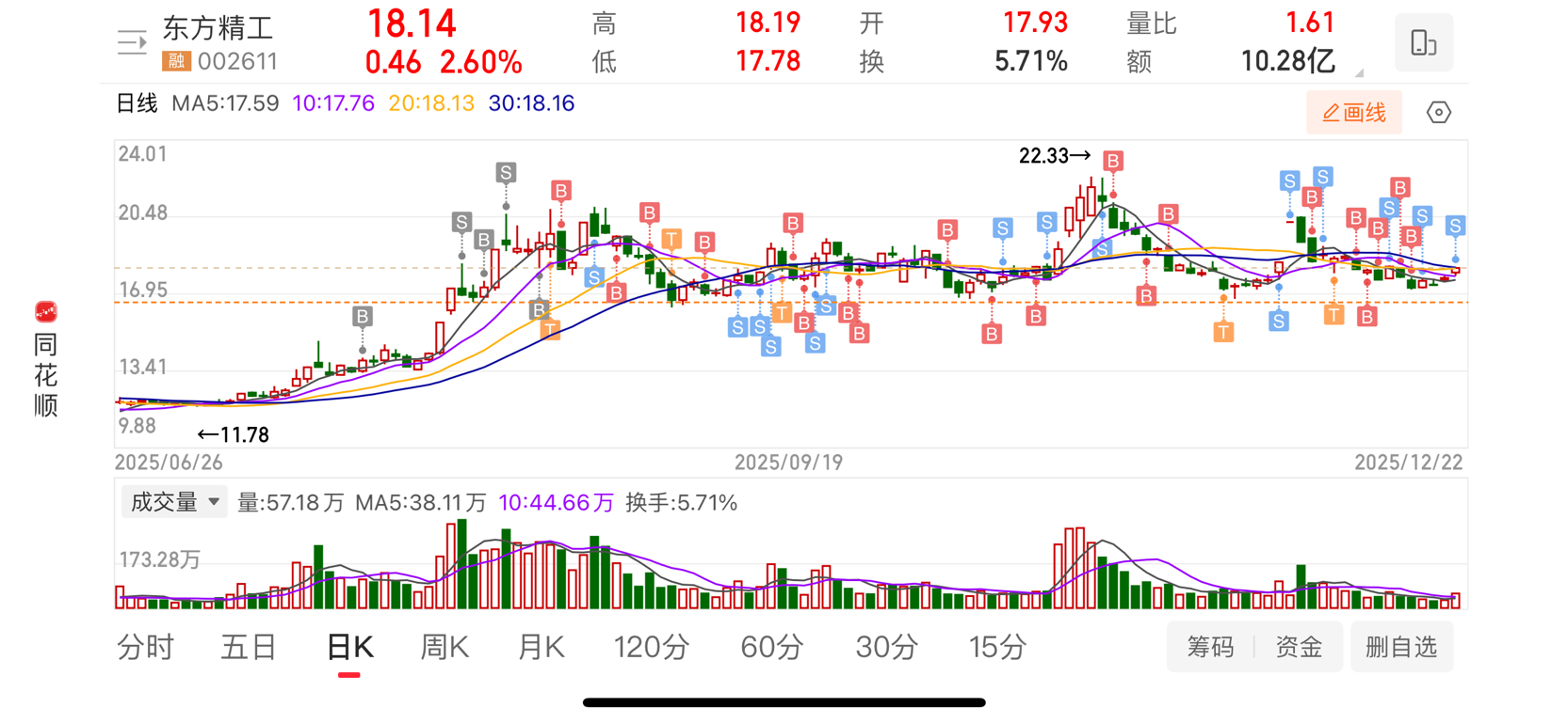 $东方精工(SZ002611)$ 17.24和17.42买入的尾盘t出去了,做t不能贪心,剩下的就是17.73上面的了加油明天6个点