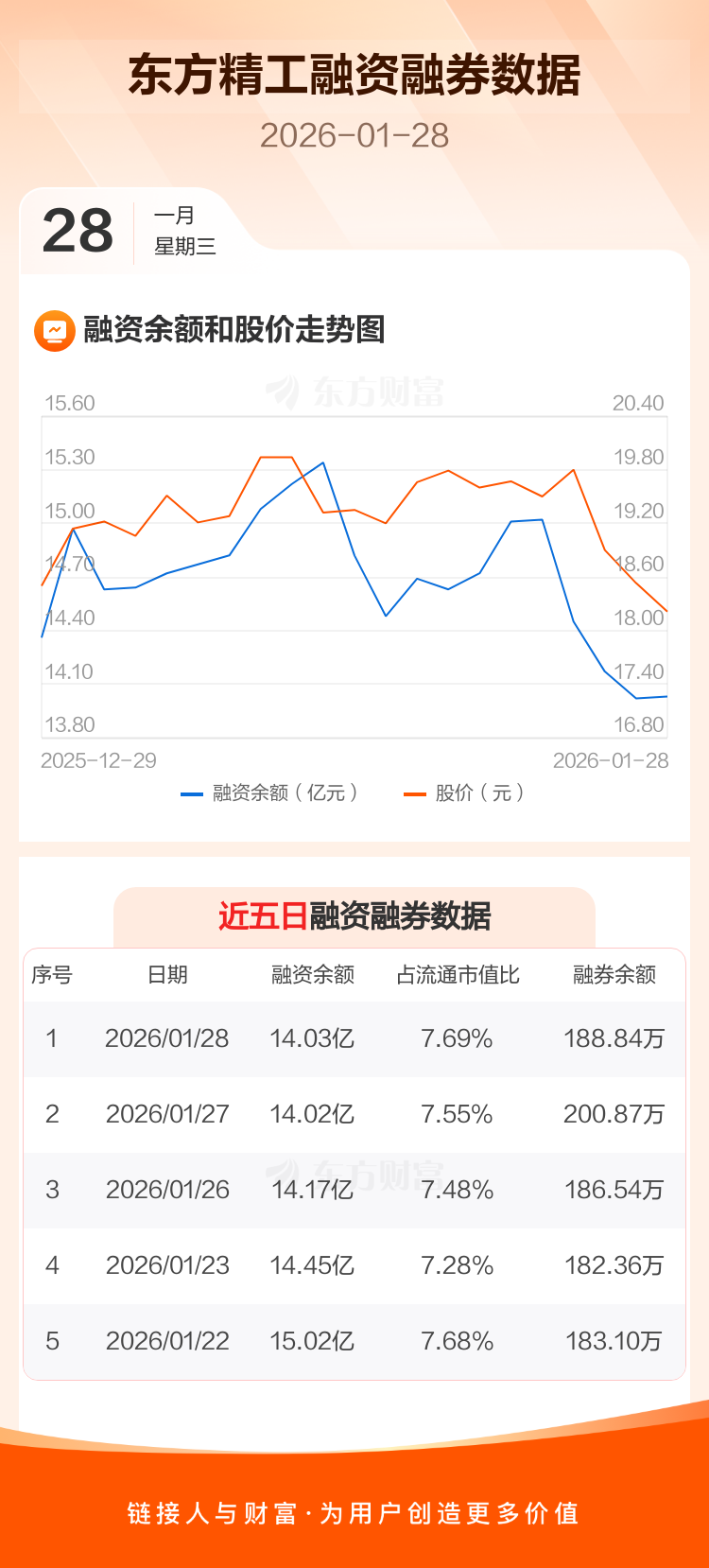 交易所最新数据显示,东方精工于2026年1月28日获融资买入7899.15万元,融资偿还7730.86万元,当日融资净买入168.29万元。目前,该股融资余额14.03亿,占流通市值比例为7.69%。