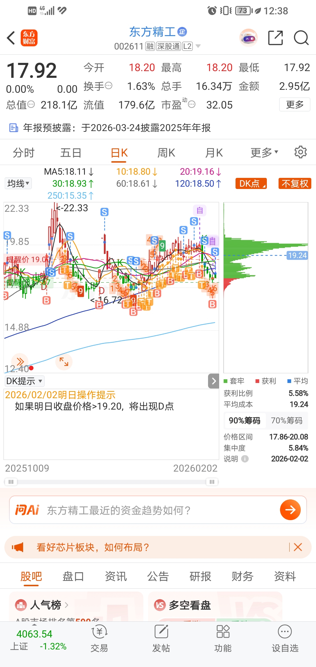 $东方精工(SZ002611)$ 今天开始空仓了,等精光在18左右形成新的筹码峰再看吧,今年1月在精光避牛市,还亏了。