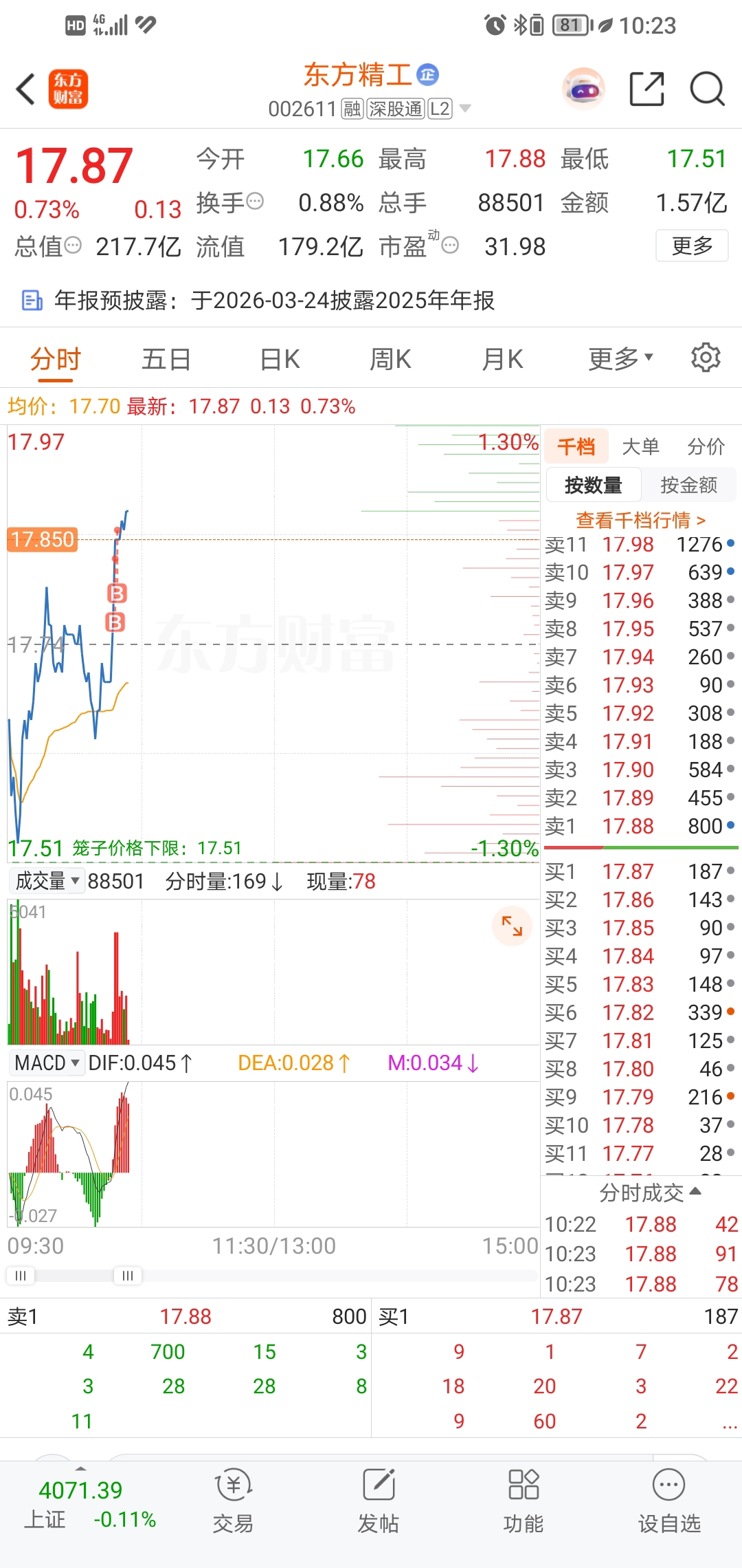 $东方精工(SZ002611)$ 我又回来了,半仓介入,跌破17.66抛