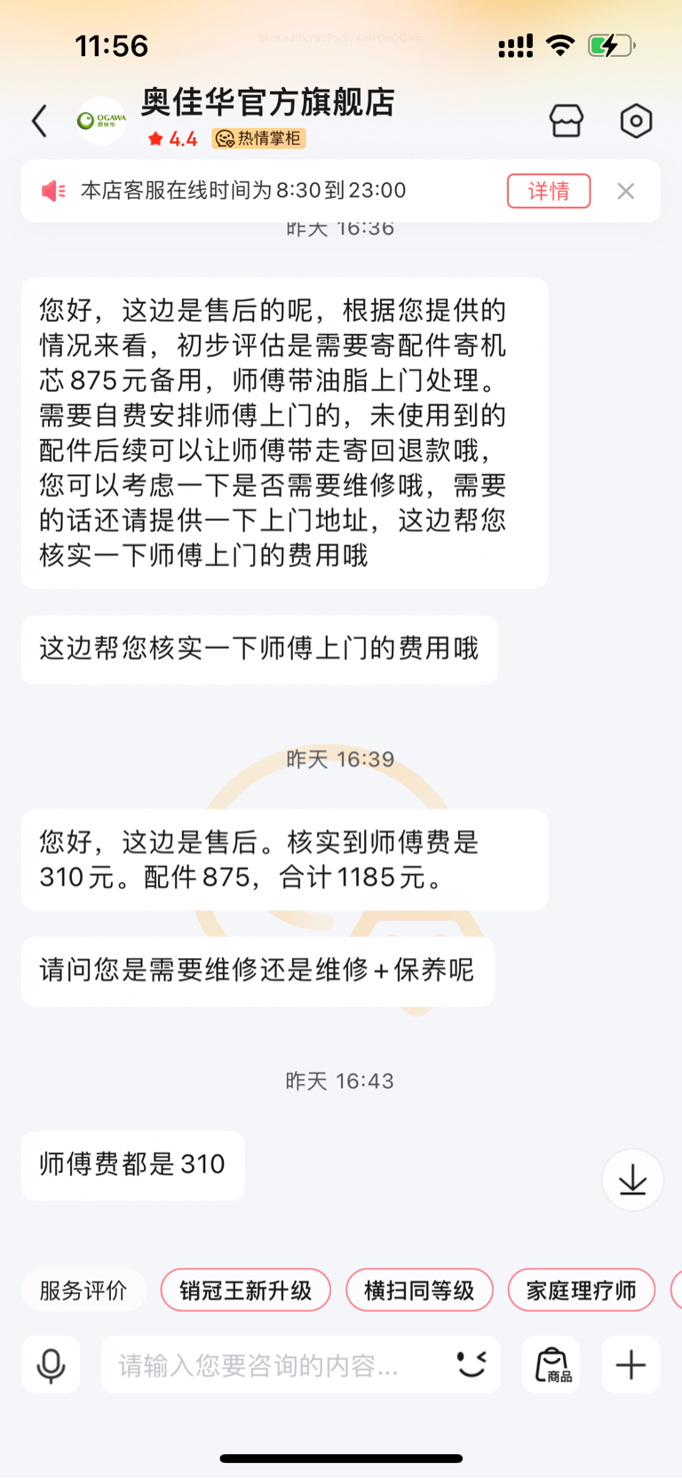 垃圾奥佳华,保养一下需要1000多,保养就是要换零件,没有希望的公司