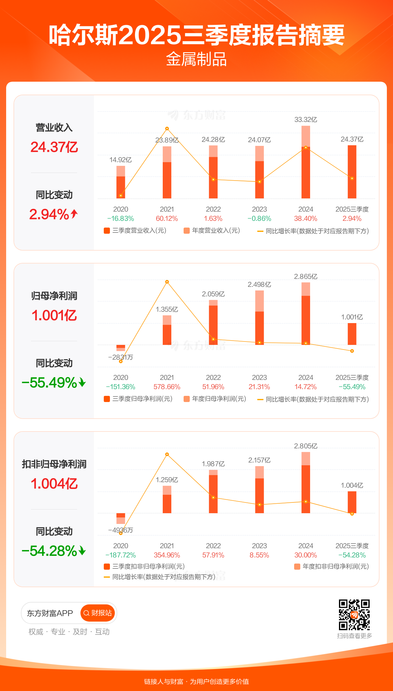 哈尔斯10月31日发布2025年三季报显示,公司前三季实现营业收入24.37亿元,同比增长2.94%;归母净利润1.00亿元,同比下滑55.49%;扣非归母净利润1.00亿元,同比下滑54.28%。