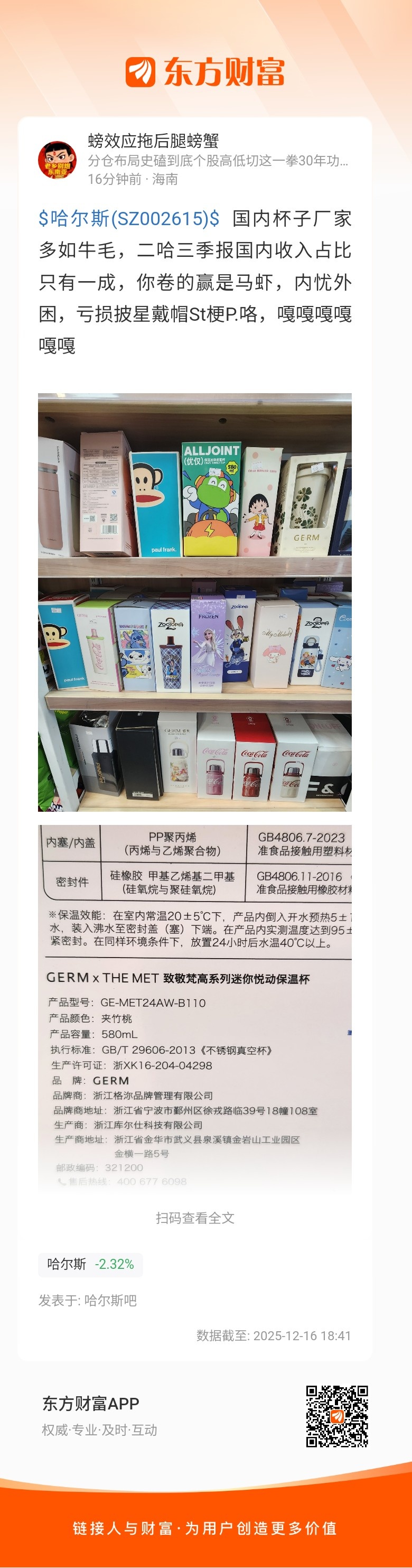 $哈尔斯(SZ002615)$ 1216东财公开新闻