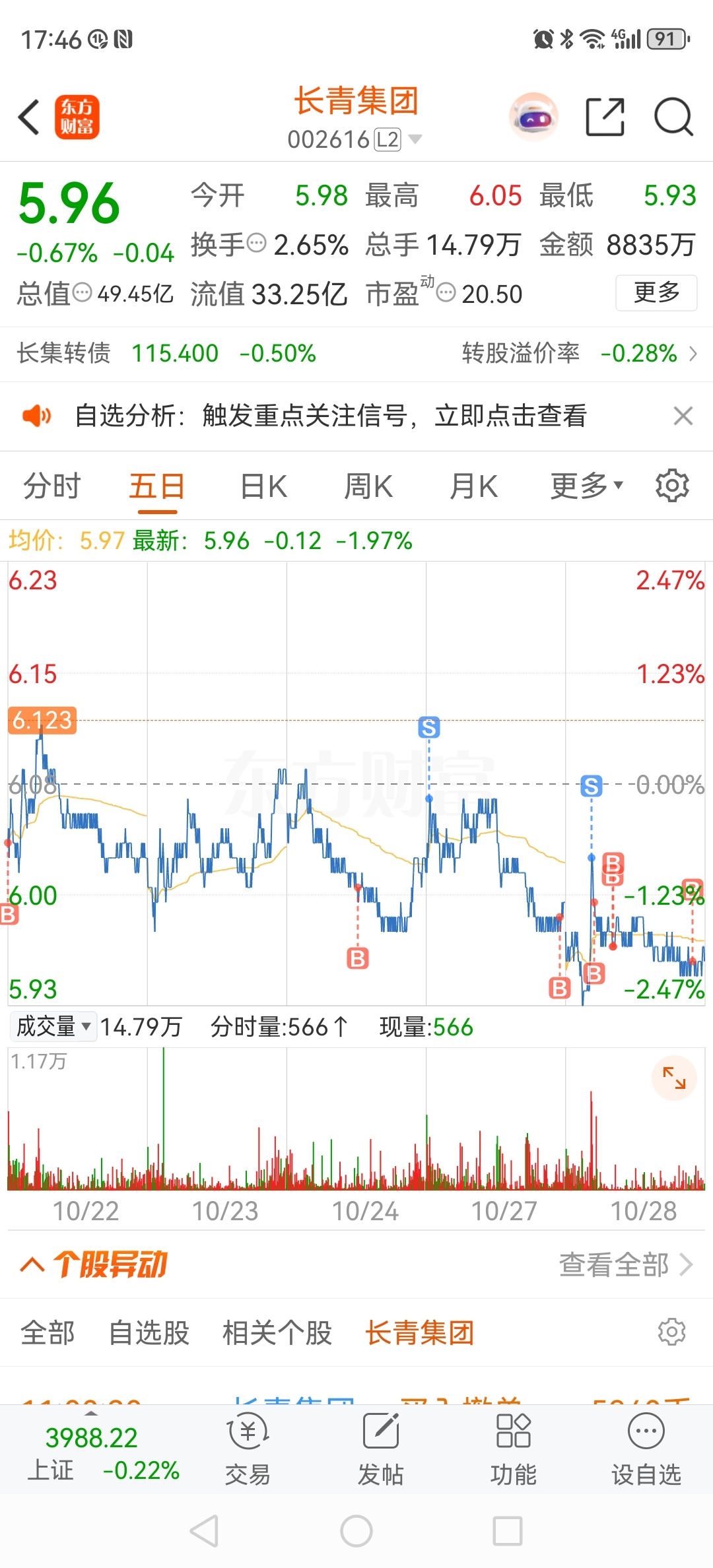 $长青集团(SZ002616)$ 今日实盘,冲高减仓,跌破6,每跌一分,加仓100手。明天是债最后一天交易日,后天放量是必然。明天竞价如跳空锁仓,开上6减仓。#收盘点评#