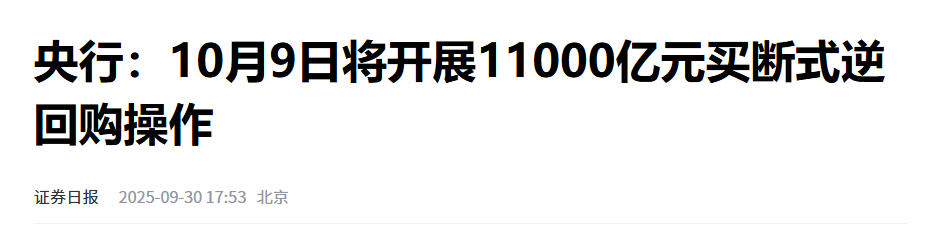 央行:10月9日进行一万壹仟亿逆回购,确保流动性充裕