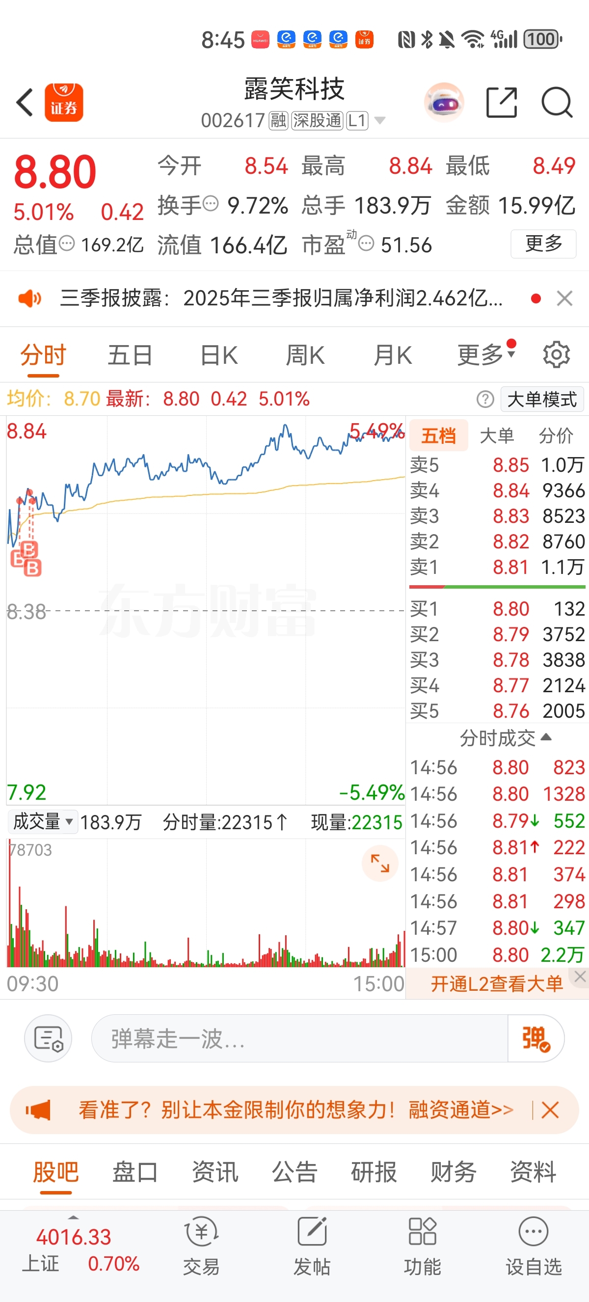 $露笑科技(SZ002617)$ 今天跑步进场,我之前说的两个条件基本都满足,底部放量,5日、10日、20日均线拐头往上。
