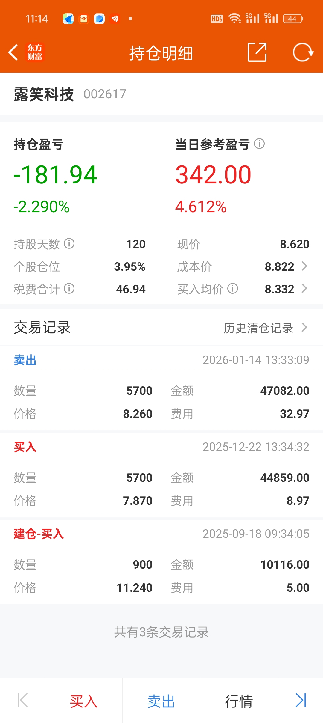 $露笑科技(SZ002617)$ #炒股日记# 有大神可以解惑吗 我底仓900股11多买的,中间做了长时间的5700股7.86买 8.26卖,我的底仓不变900股,这样不应该是我成本降了,底仓的金额不变吗。现在的底仓不变 金额少了 成本降了 我的疑惑就是我为什么金额少了,不应该不变吗