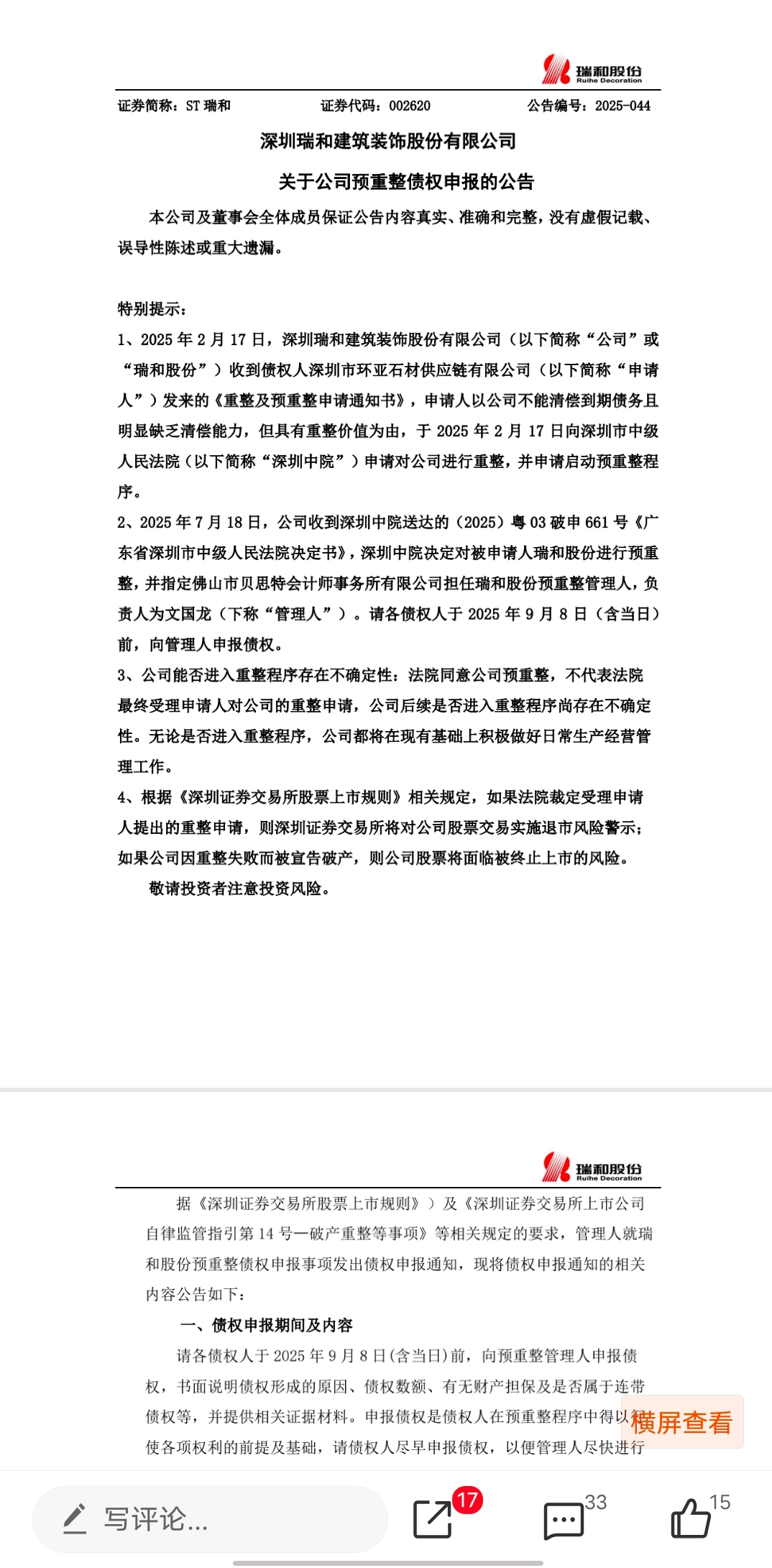 $ST瑞和(SZ002620)$ 9月8日债务申报结束,现在11月,过去2个月了,快行动吧