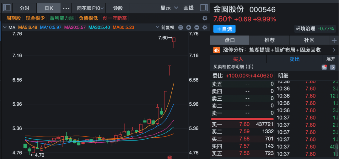 盐湖提锂概念延续涨势,金圆股份3连板,盐湖股份、西藏珠峰、科达制造、赣锋锂业、天齐锂业等涨幅居前。消息面上,广期所碳酸锂期货主力合约持续大涨。