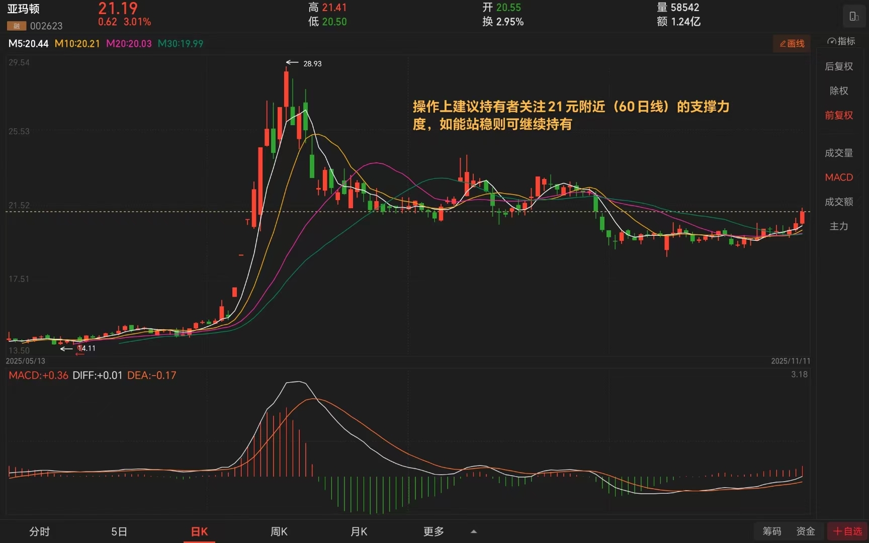$亚玛顿(SZ002623)$ 当前5日线,10日线与20日线呈开始向上发散,并站上了60日线,MACD指标也接近0轴,红柱逐渐放大,不过换手率与资金面稍弱,操作上建议持有者关注21元附近(60日线)的支撑力度,如能站稳则可继续持有。