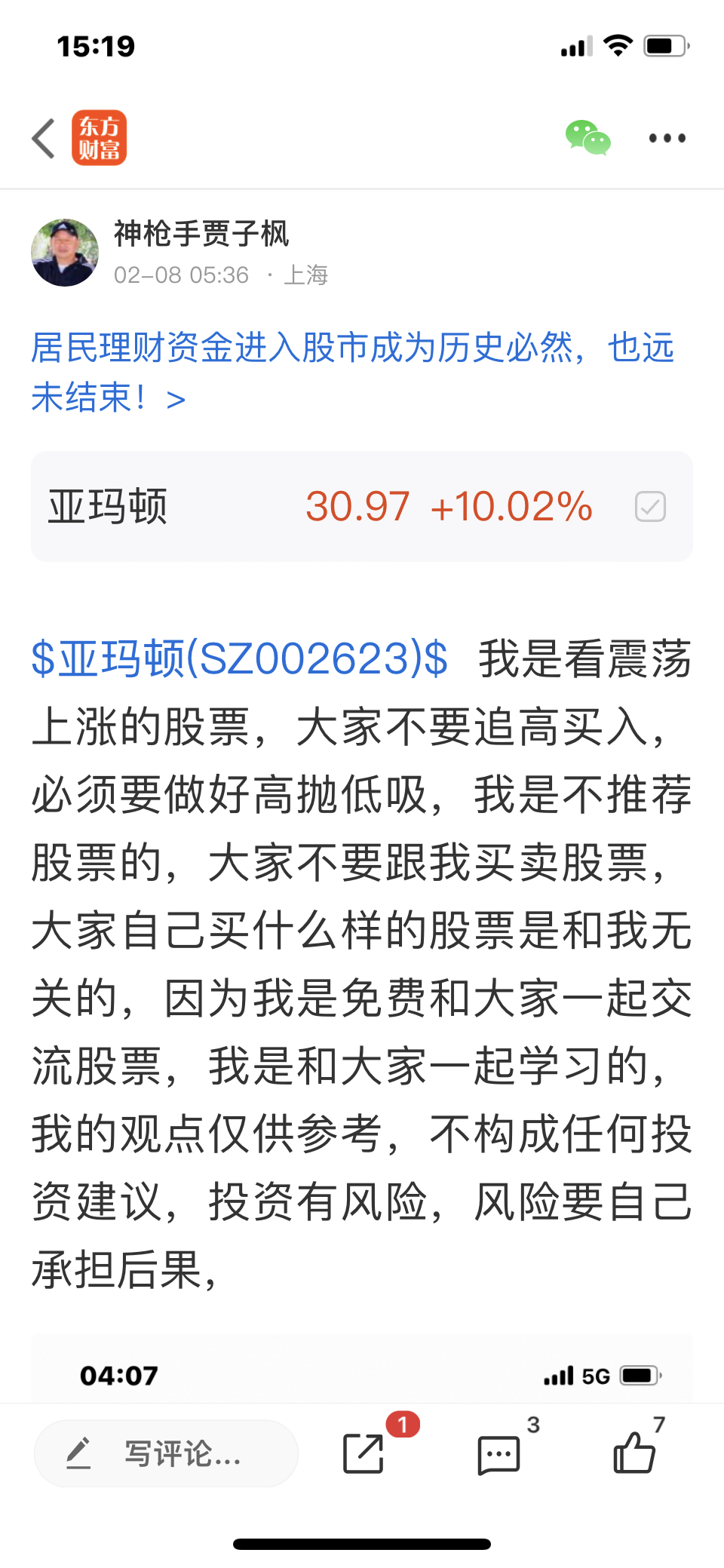 $亚玛顿(SZ002623)$ 大家不论看好什么样的股票,一定不要追高买入,必须要做好高抛低吸,我是不推荐股票的,大家不要跟我买卖股票,大家自己买什么样的股票是和我无关的,因为我是不推荐股票的,我是免费和大家一起交流股票,我是和大家一起学习的,我的观点仅供参考,投资有风险,风险要自己承担后果,