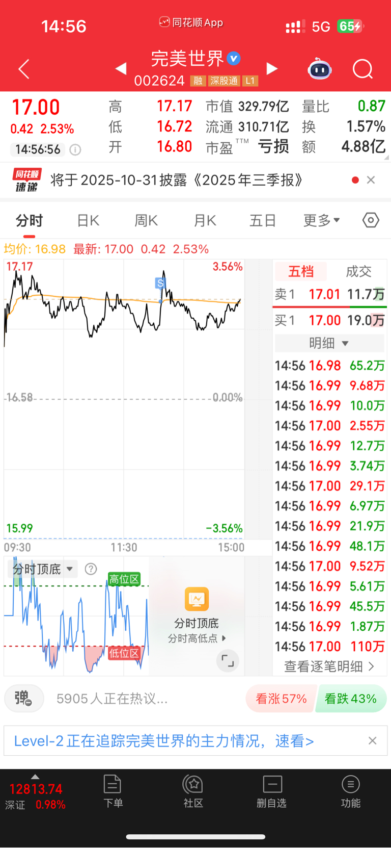 $完美世界(SZ002624)$ 16.99把上周16.6低吸的抛,明天看情况接回