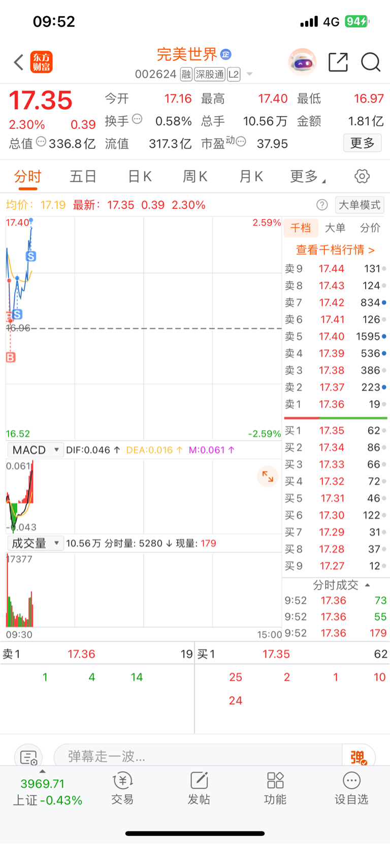 $完美世界(SZ002624)$ 留下做T买入的走了