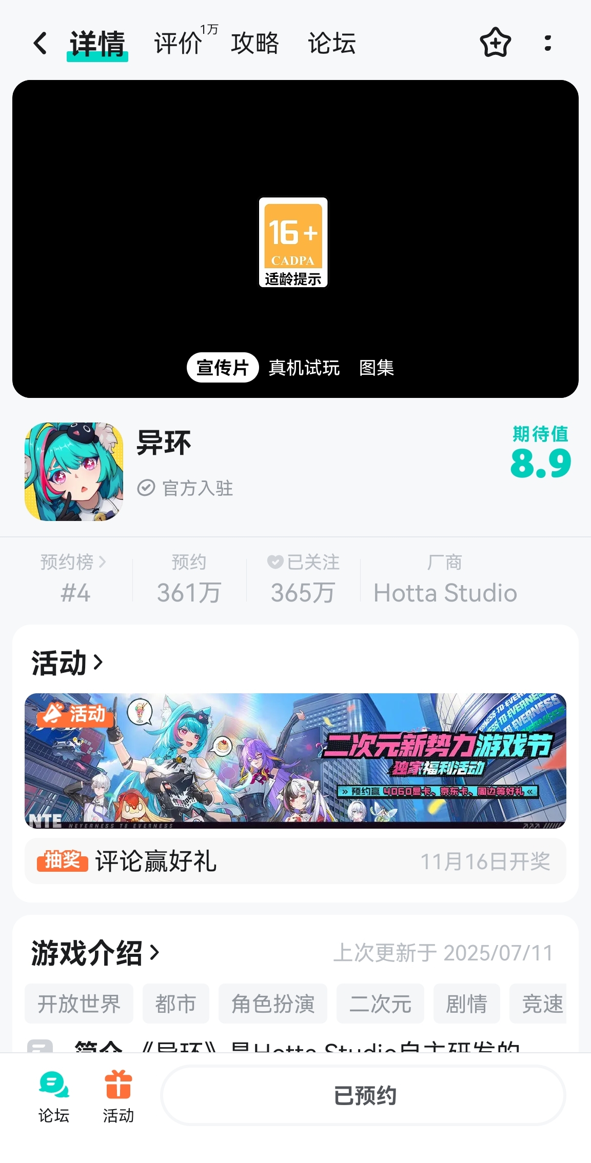 $完美世界(SZ002624)$ 异环tap预约人数来到了360万,高居新游预约榜首